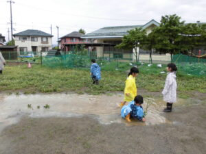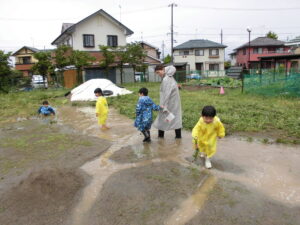 自然にできた水たまりの中で大好きなどろんこ遊びを満喫し、満足そうに遊ぶ姿を見て、子どもたちと一緒に雨の日も楽しいなと感じた一日でした。