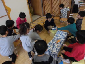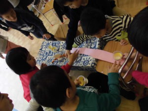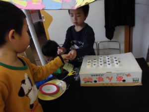 これには他のクラスの子たちも大喜びで、「僕もやりたい!」という声も上がり、順番に回転寿司ごっこを楽しんでいました。