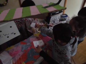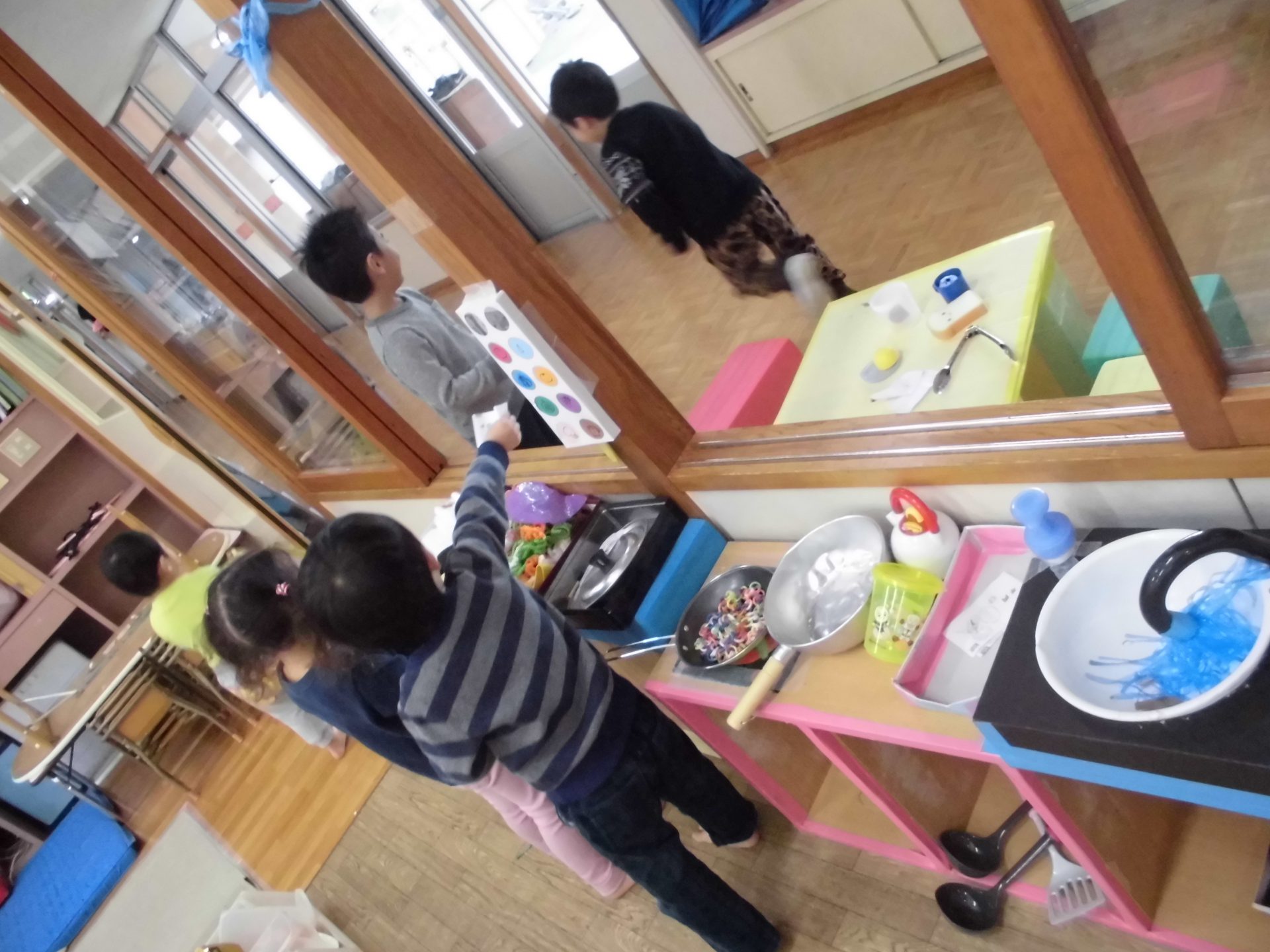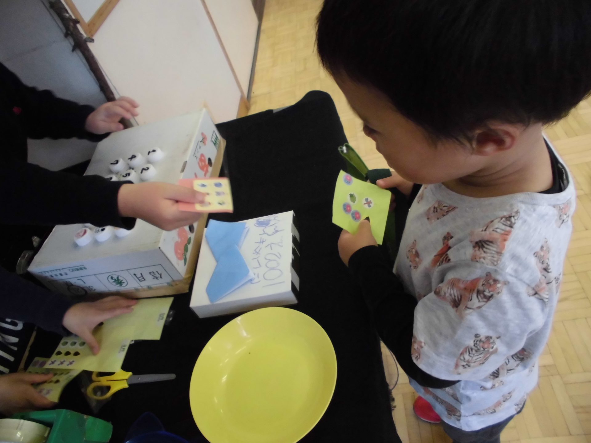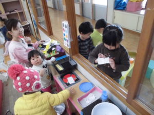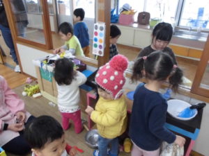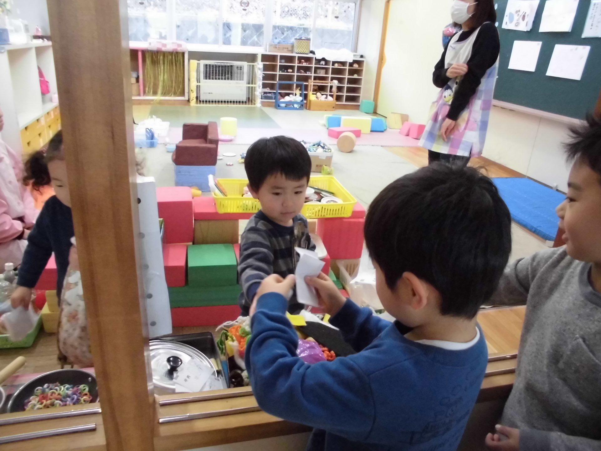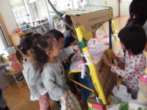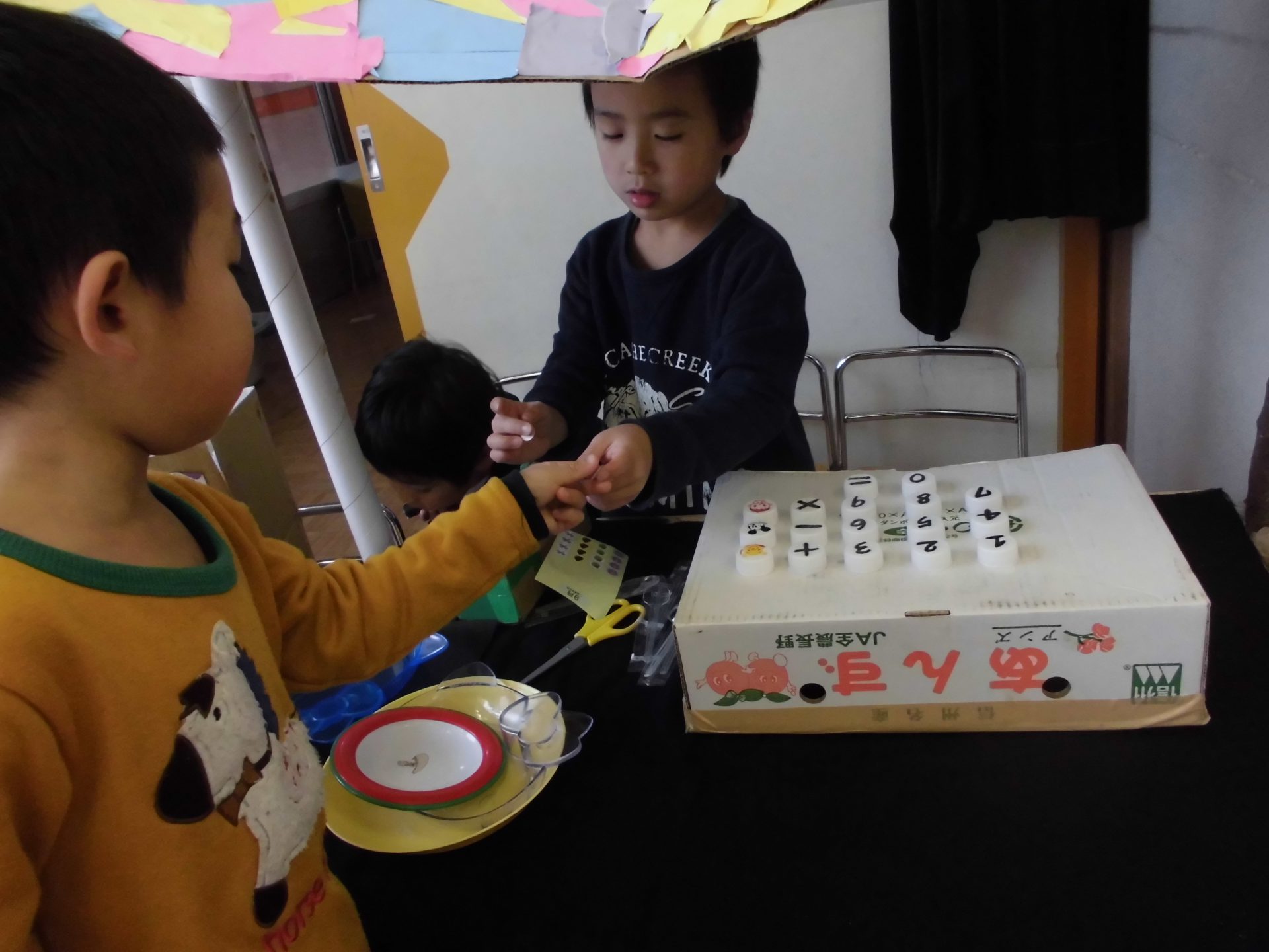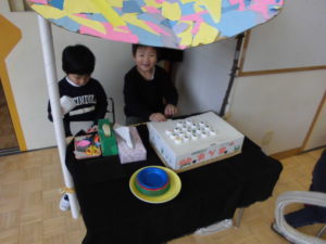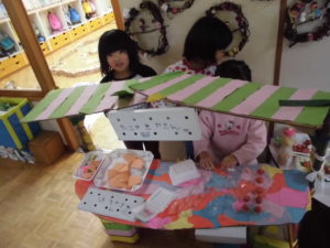 そして、「僕達もやりたい!」につながってお部屋で今度は店員さんに♪年長さんの姿を見て真似ている子もいれば、自分の経験したことを発揮している子もいて驚きでした。
