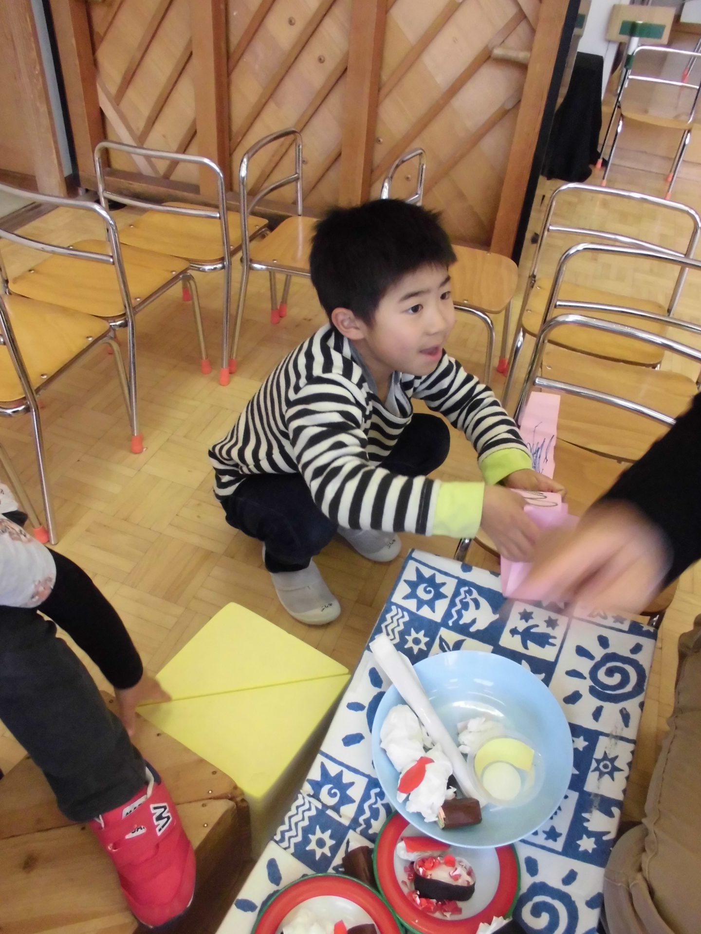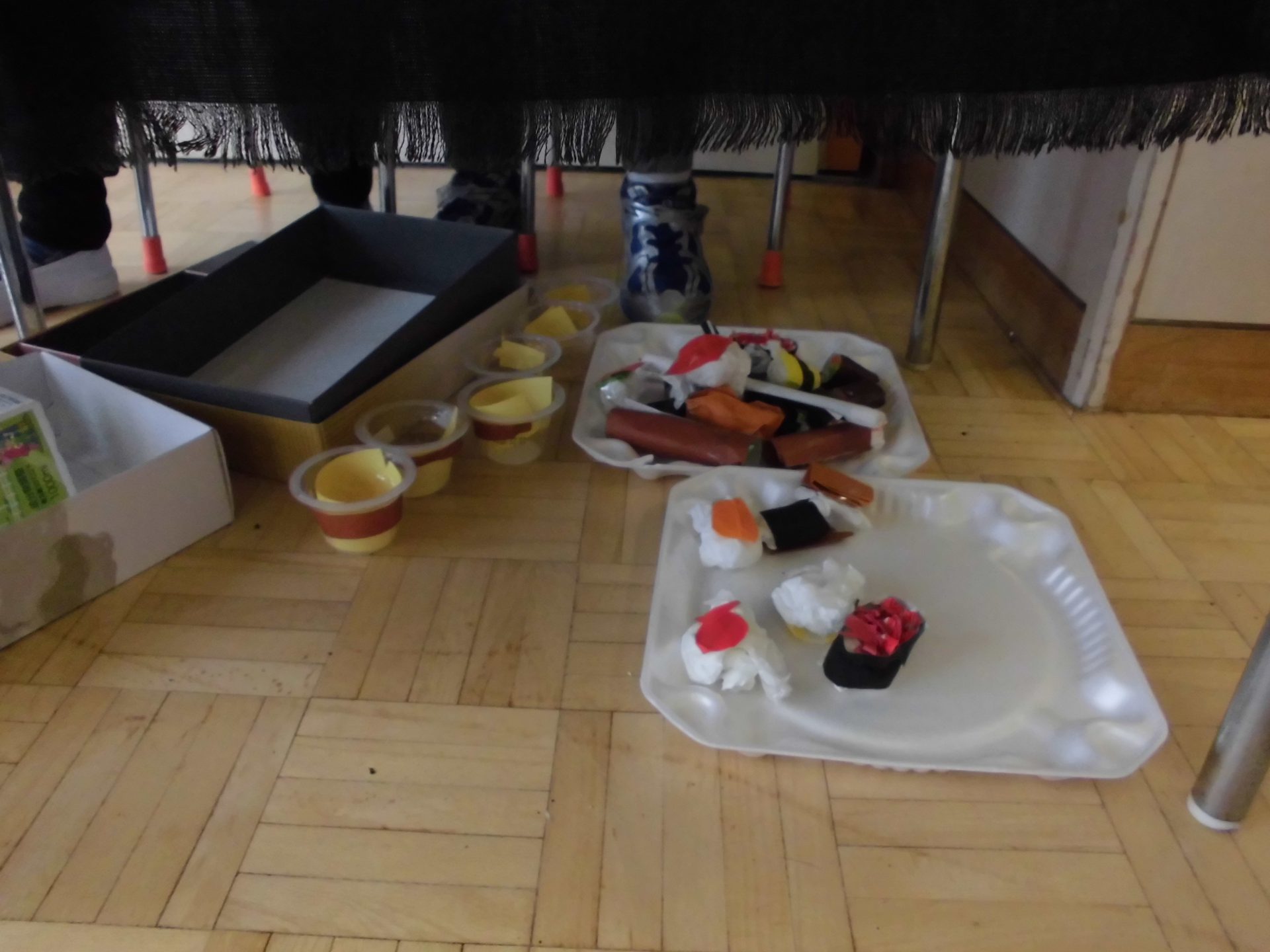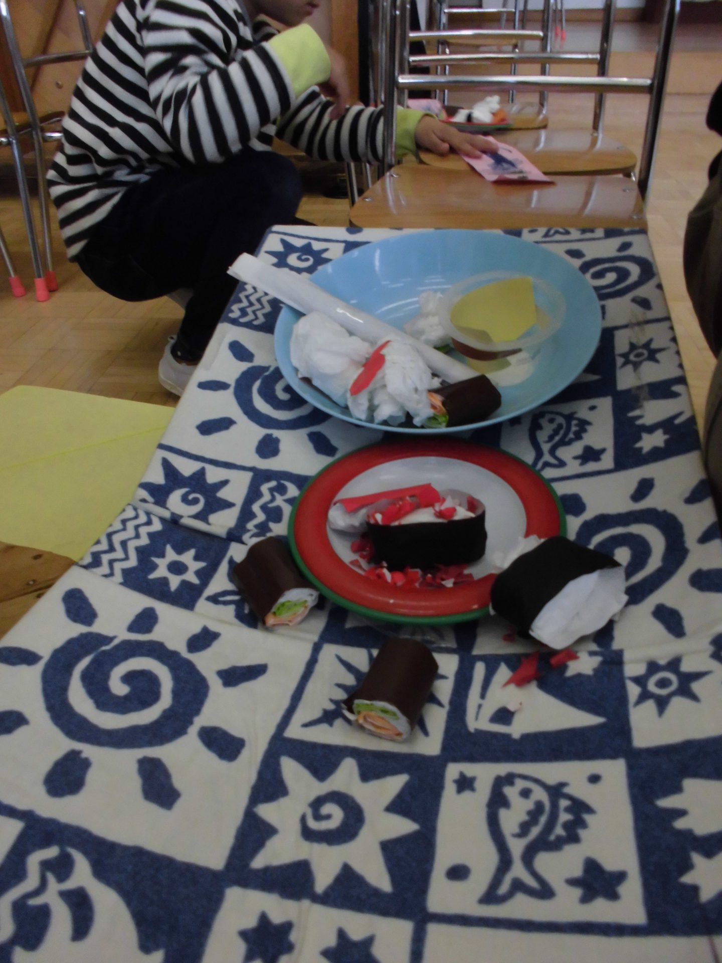 朝、年長さんから「お寿司屋さんやりまーす!来てください!」「たこ焼きもありますよ!」と、元気なお誘いがありまして・・・