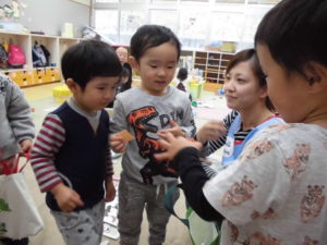 「あっちーよ。」と言って渡そうとし、手を伸ばした1歳児の男の子も