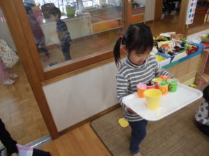 2歳児さんはせっせこジュース運び♪「どうぞー」と、可愛らしいウェイトレスさんに♪