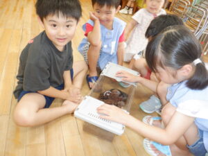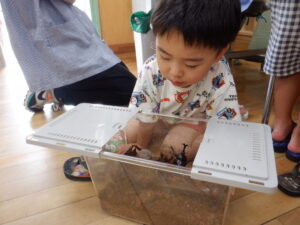 ・地域の方が子どもたちのためにと思って持ってきてくださったカブトムシから様々なことを感じている子ども達。地域の方とのつながりは大事にしていきたいと思う。