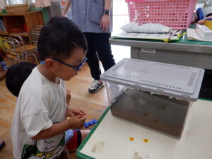 2つに分けている間「ゼリーがなくなっているぞ!食べたんだね」「土を入れたら土の中に入ろうとしているよ!土が好きなんだね」と観察を続けていました。