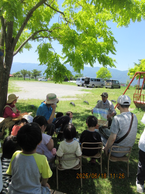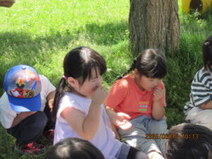 真夏の暑さですが、園庭の大木の下、涼しい木陰でのお勉強会です。
