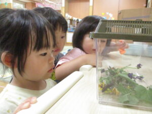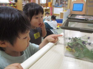 最初は「こわい」と言っていた子も少しずつ虫に慣れていき、毎日様子を見るようになっていきました。