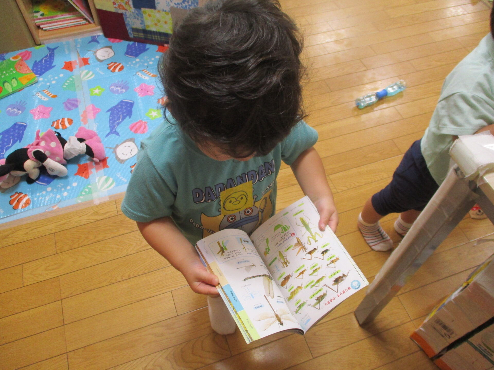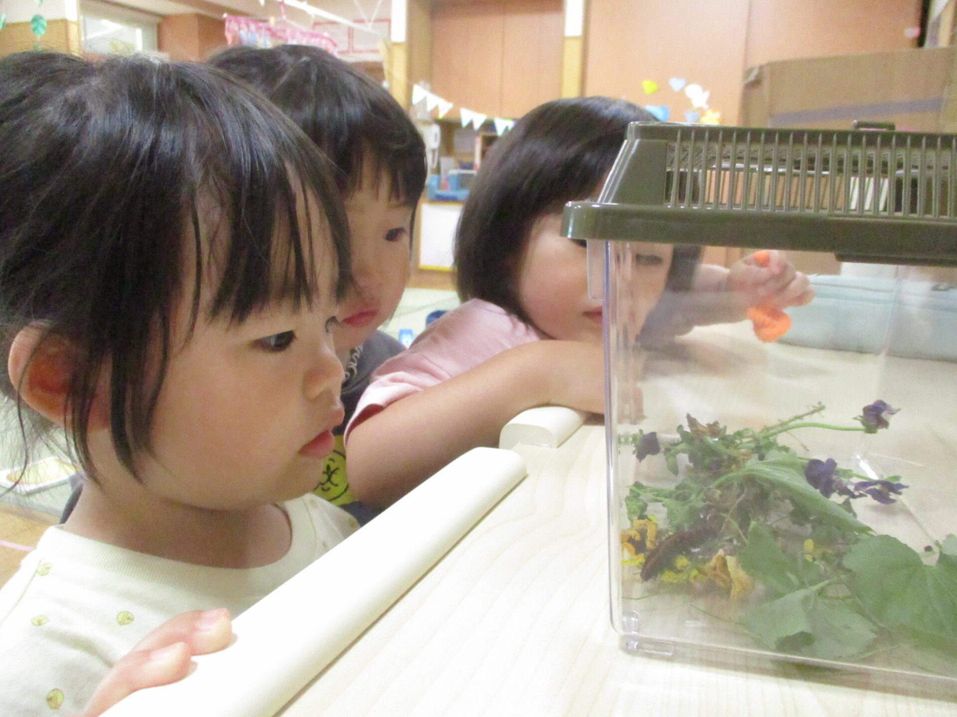 クラスにある図鑑で「なんの幼虫かな?」と調べる姿や、さなぎになると「へんしんした!」「これ何?」と不思議そうに見つめていました。