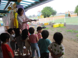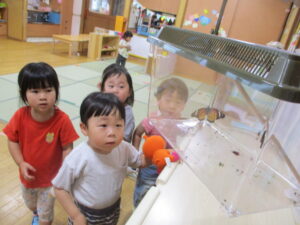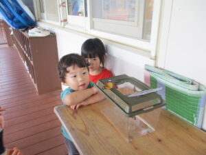 保育士が虫カゴにつかまえてくると「これ何?」「むし?」「こわい?」とみんなで見はじめました。