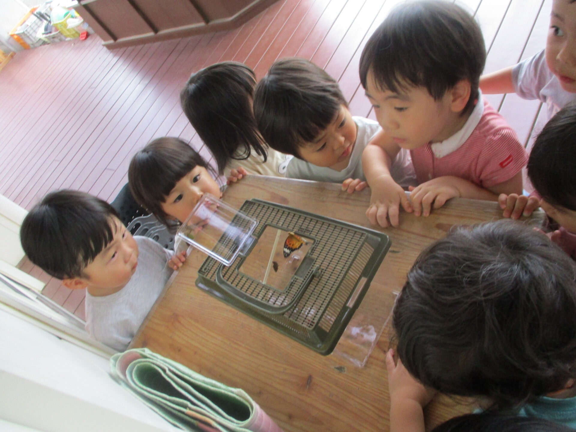 幼虫から蝶に変わっていく姿を友だちや保育士と喜んだり、驚いたりしていた子どもたち。
