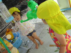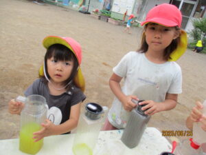 ・お姉さんお兄さんがピッチャーに入れた色水をカップに入れて遊んでいるのを見て「やりたい!」と一緒になって遊び始める。「ジュース屋さんだよ」「ジュースちょうだい!」自分でカップにジュース(色水)を入れることも嬉しいな。