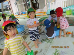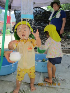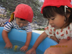春から砂遊びや草花遊びを十分にして砂や水の面白さや不思議さを楽しんできた経験が積み重なって、夏ならではの遊びで全身を使って思い切り遊ぶことができている。