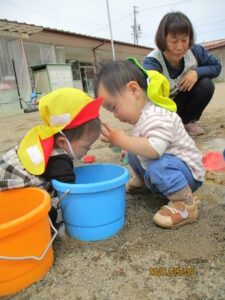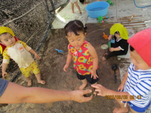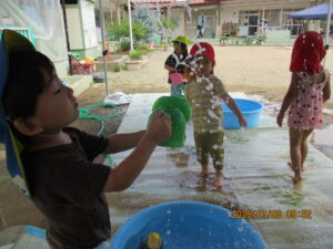 夏が来てどろんこ遊びが始まると同じ園庭で遊んでいるお姉さん、お兄さんがやってるシャボン玉遊びに興味津々。