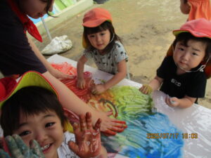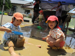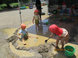 最初は水や泥が身体につくことが苦手な子もいたが、様々な経験を通して“やってみたい” “さわってみたい”とわくわくする気持ちが大きくなり今では全身びしょぬれになってどの子も泥や水を使って遊び込んでいる。