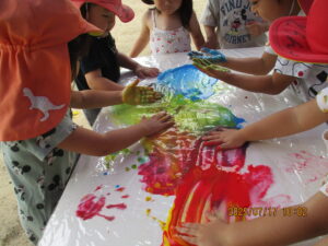 フィンガーペインティングも経験して、いろいろな感触を楽しんでいます。