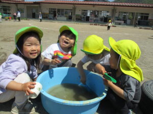 乾いていた砂が水を吸いぎゅっと固まる様子が面白く何度も水をかける子どもたちの姿がありました。