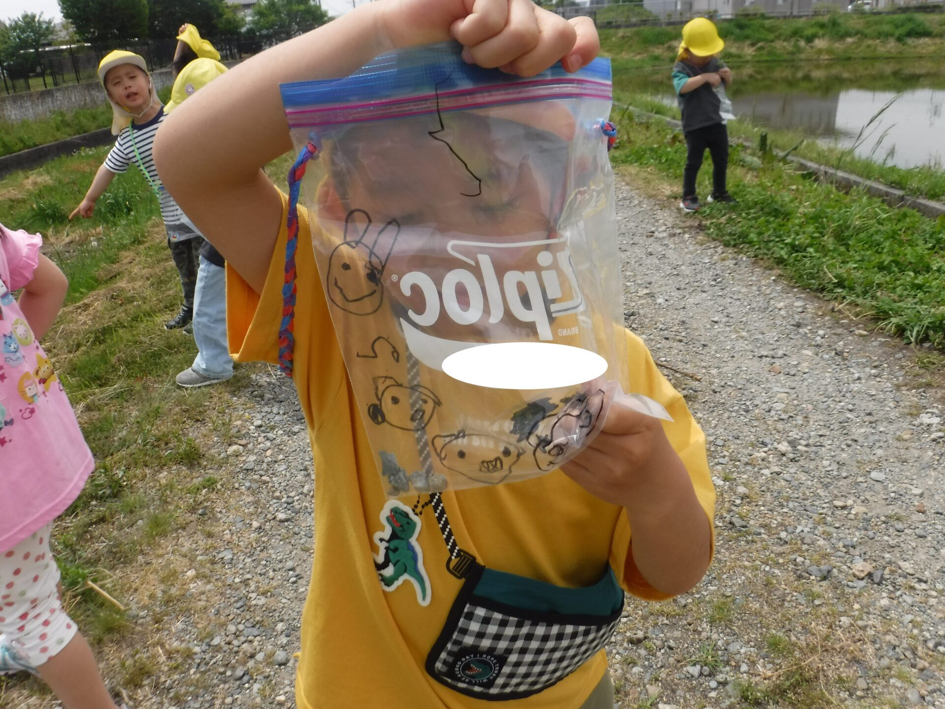 保護者の方と一緒につくったお散歩バックをかけて