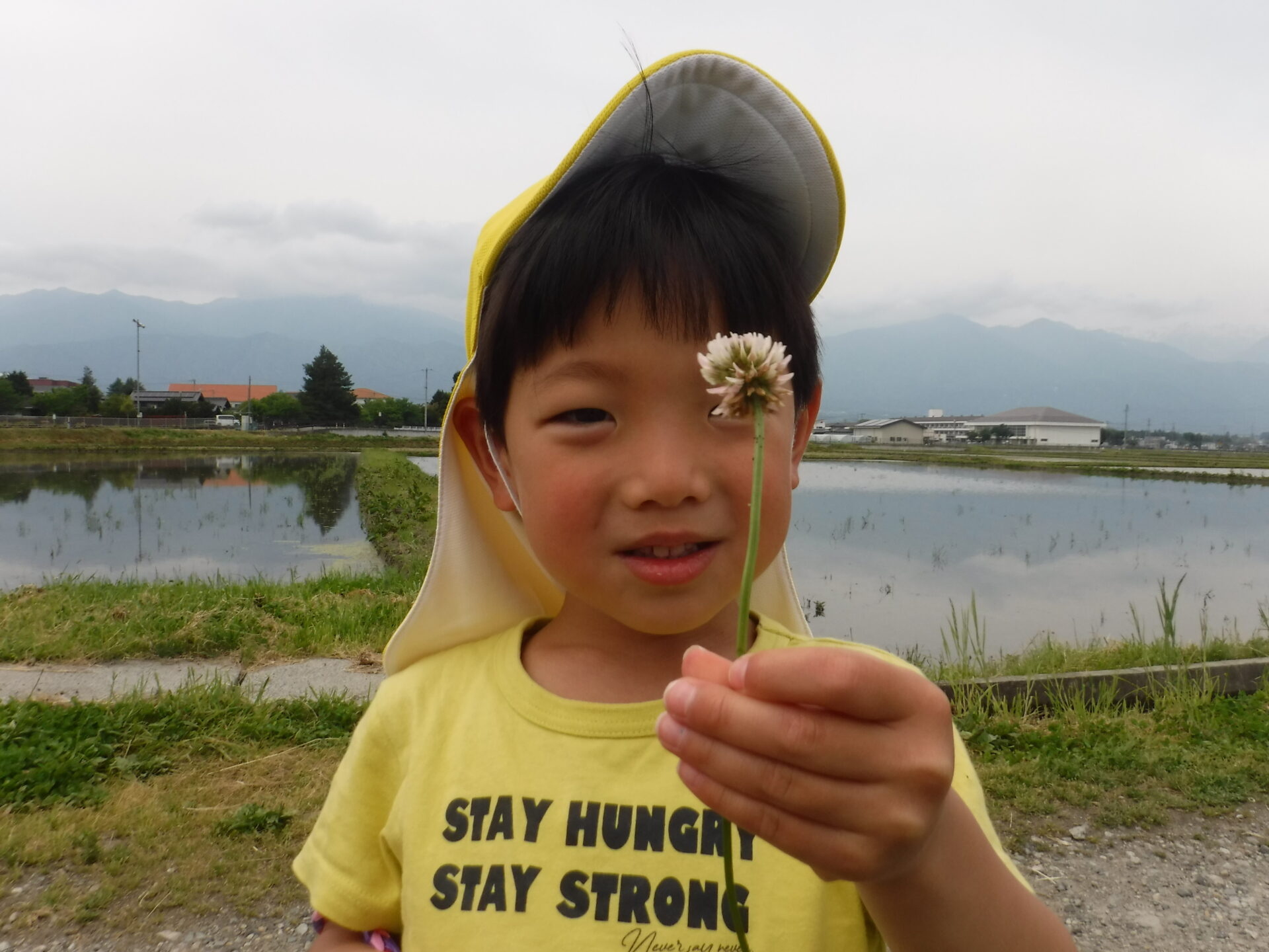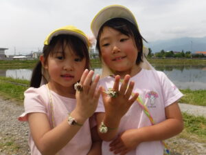 沢山のきれいな草花、田んぼにうつる安曇野の山、カエルの合唱、小川の冷たさなどただ歩くだけではなく、子どもたちは季節の移り変わりを目で見て、肌で感じて楽しんでいます。