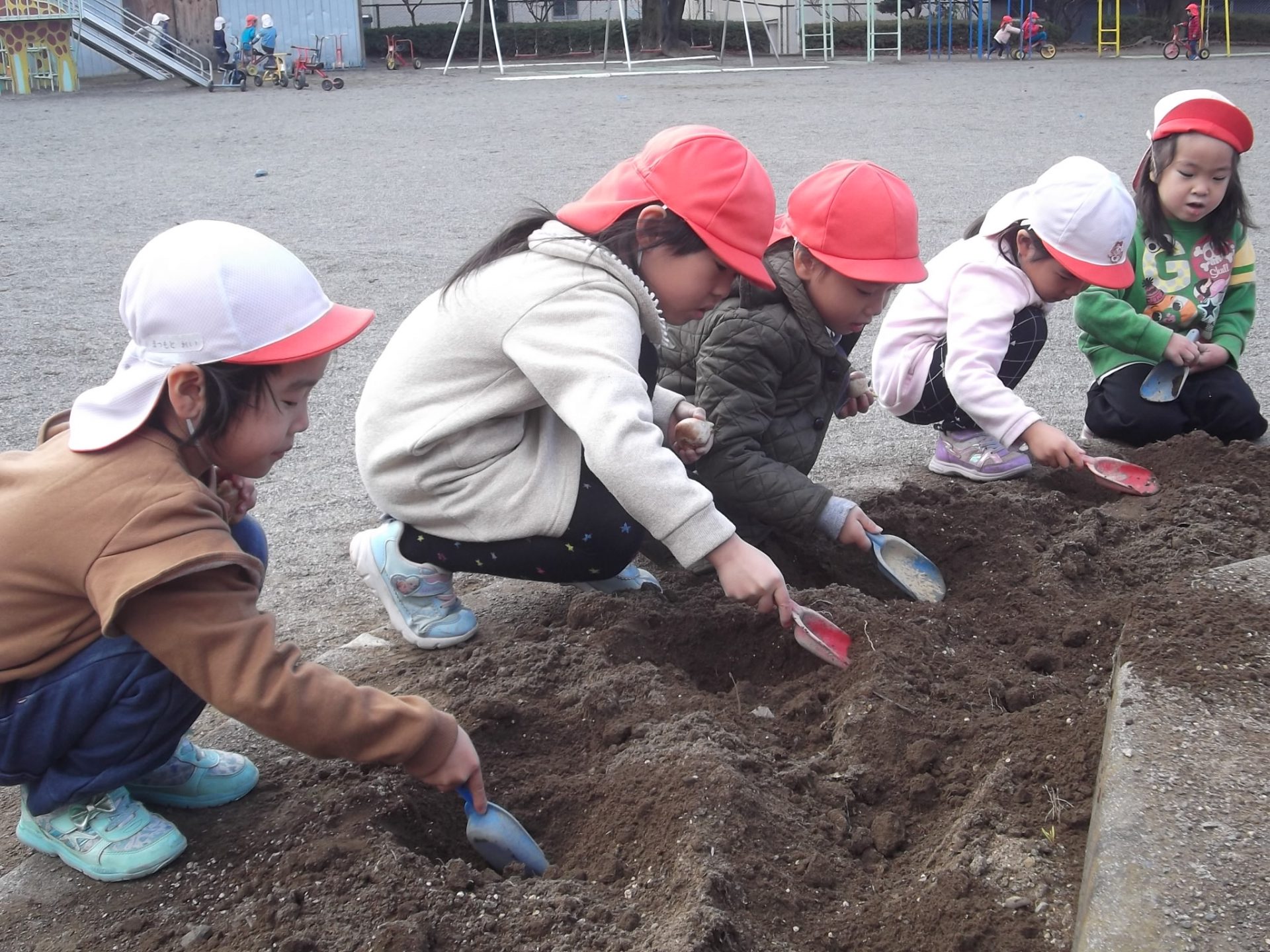 球根を植えるときに、「玉ねぎみたい」と形をまじまじ観察したり、しっかりと穴を掘る子ども達の姿が印象的でした。