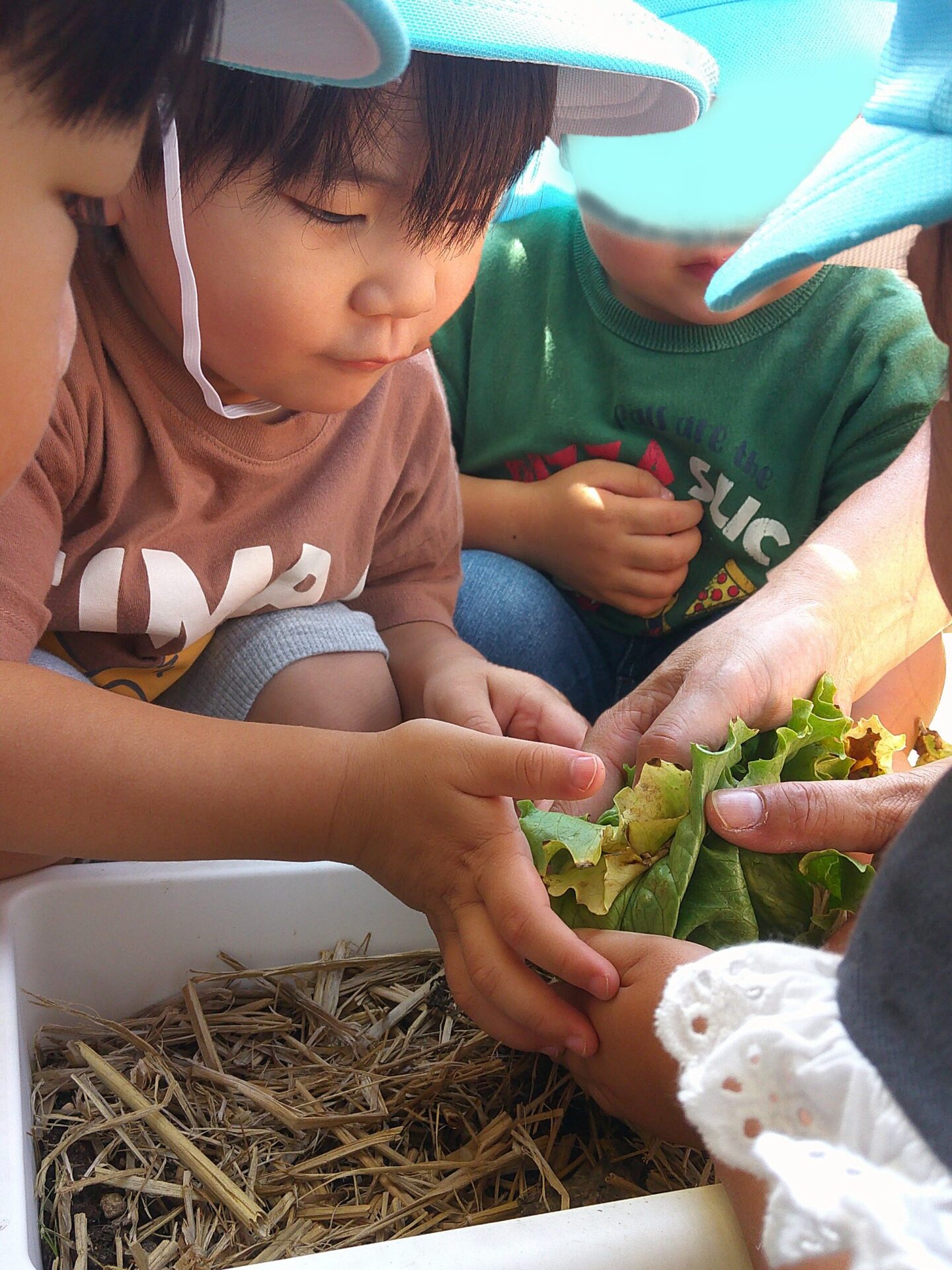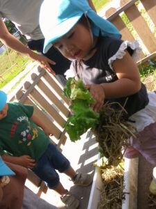 収穫したレタスに鼻を近づけて・・・「レタスのにおいがするよ。」