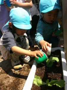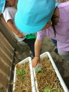 わらのお布団をかけてあげたレタスさん、子どもたちは戸外に出るとカップを持って、忘れずに水くれをします。