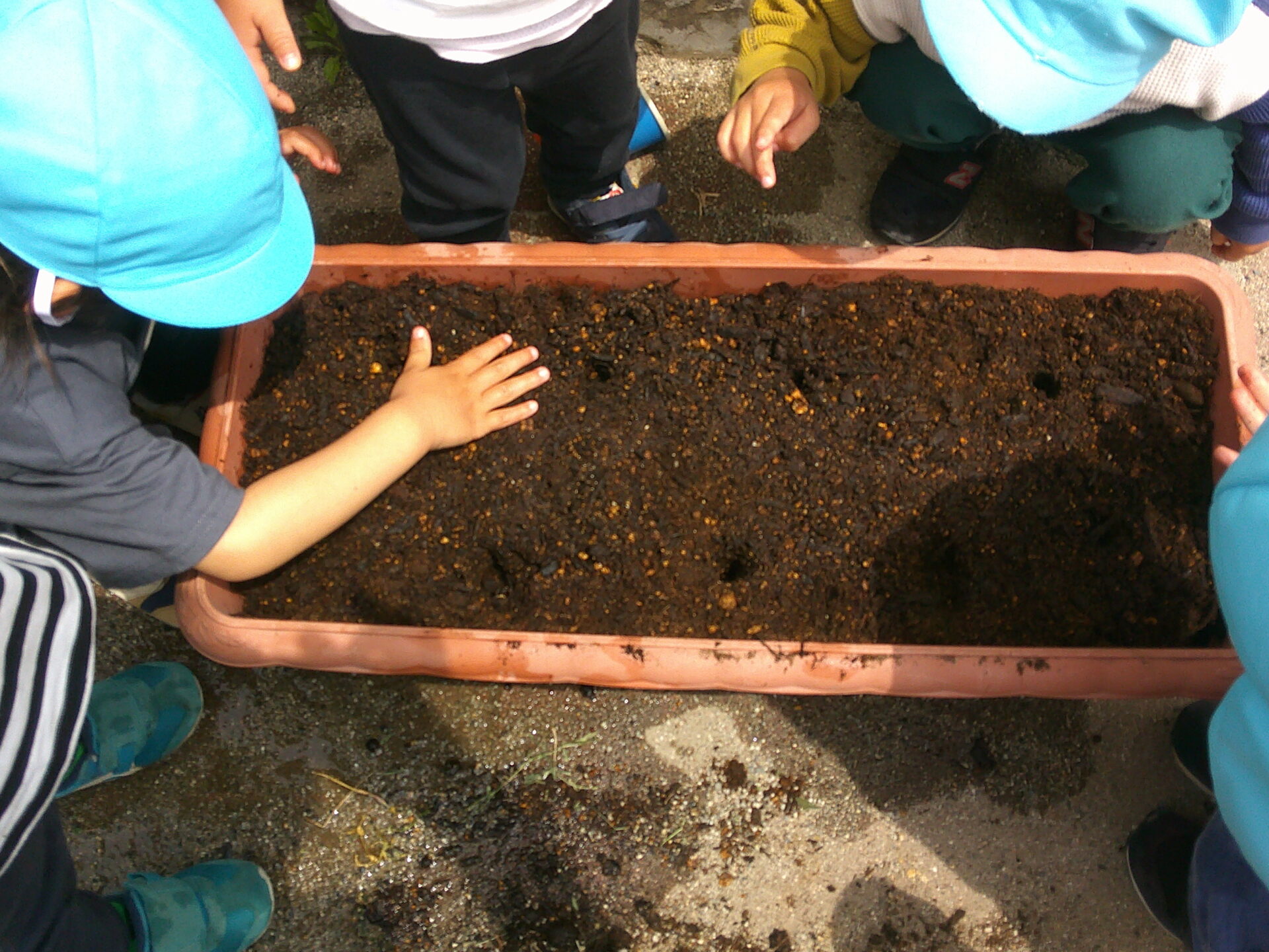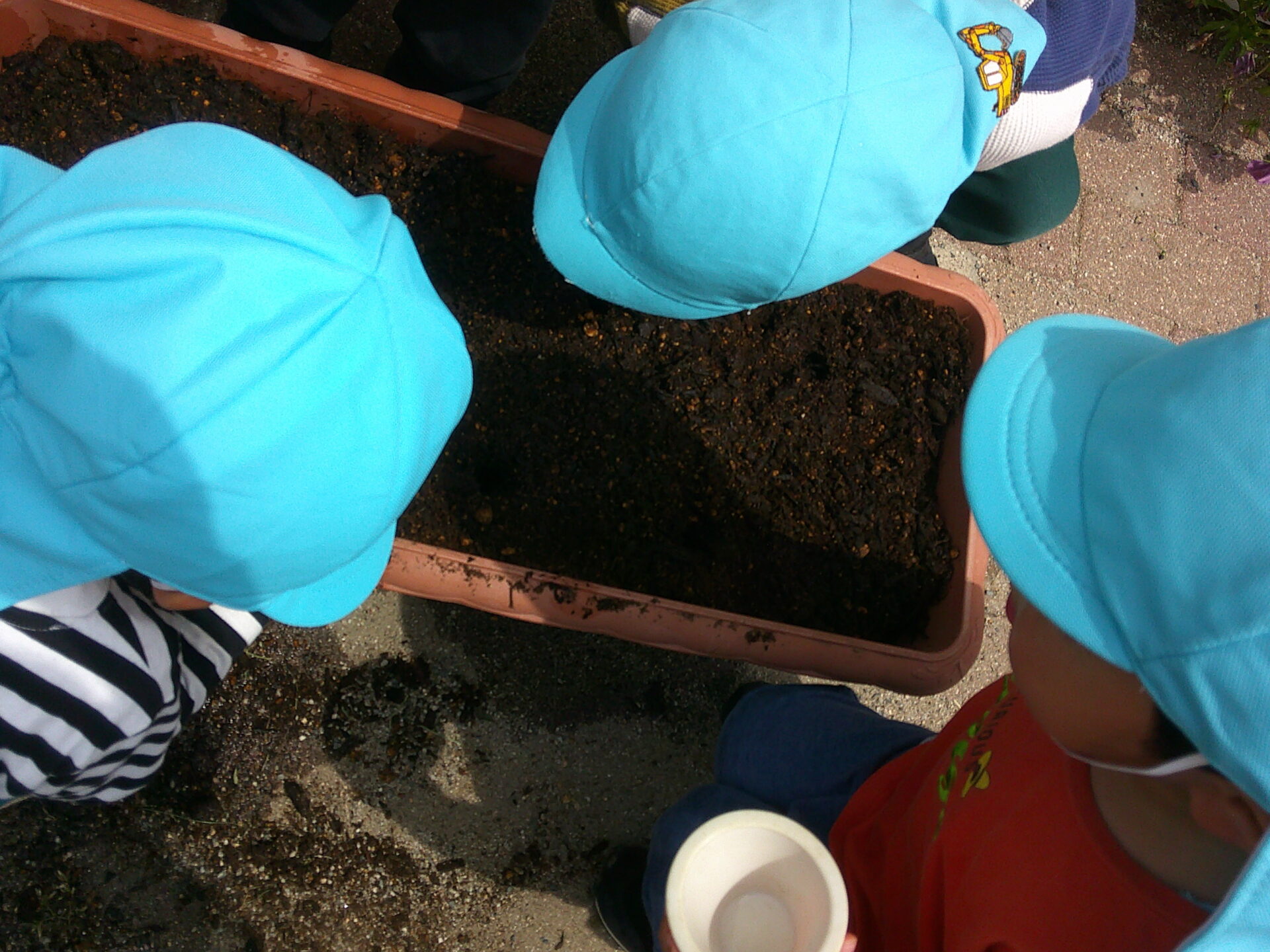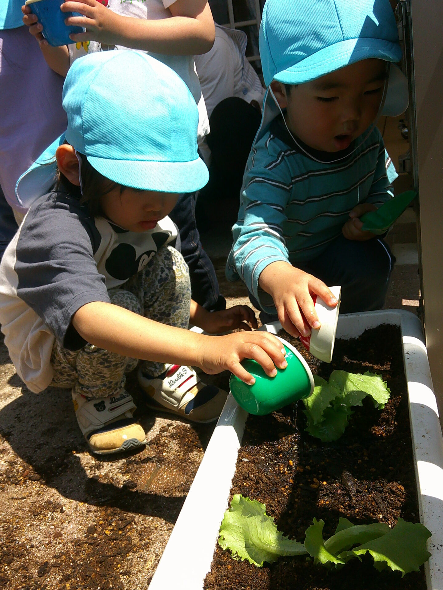 5月 レタスの赤ちゃんを植えるため、みんなでスコップをもってプランターに土を入れました。