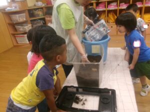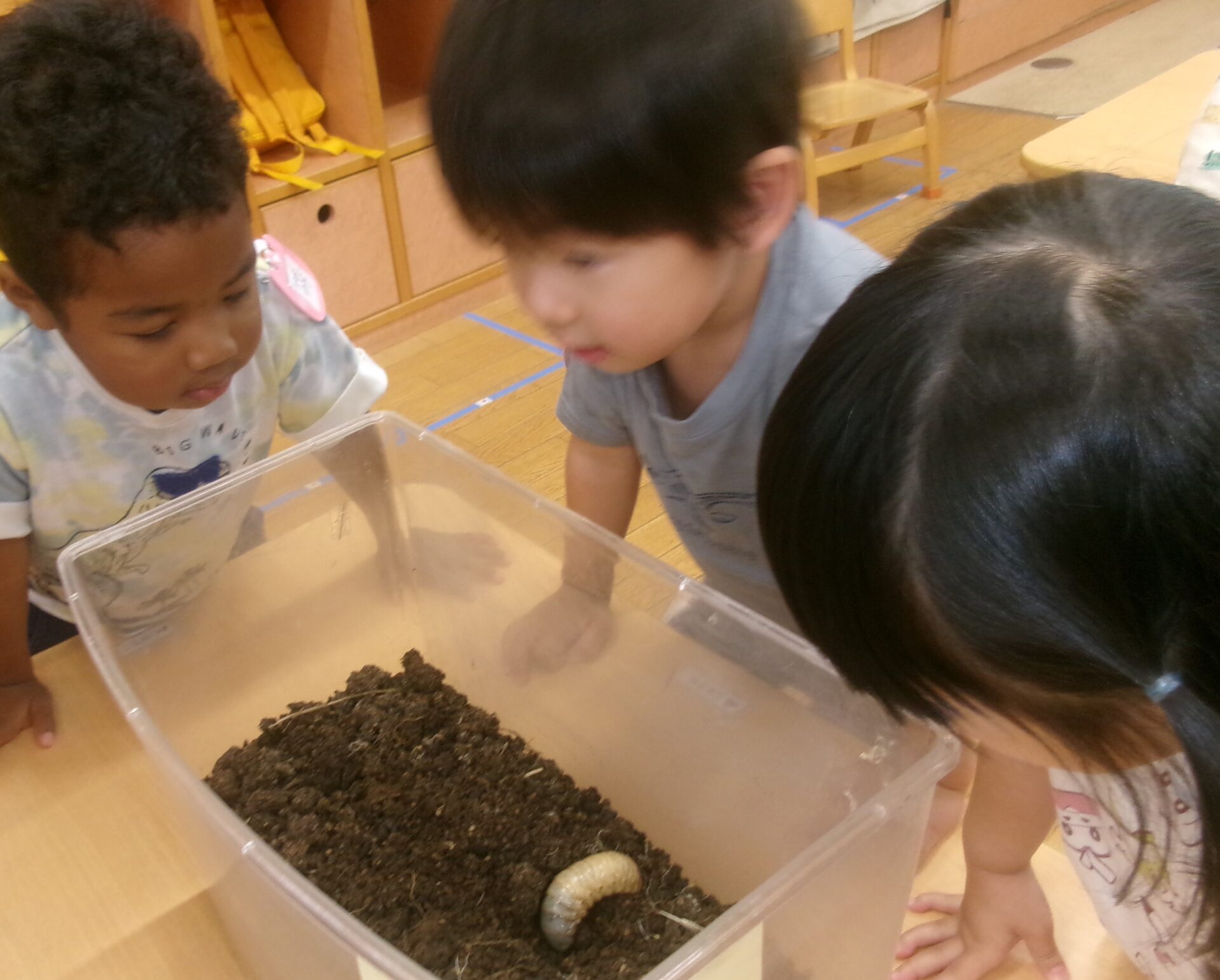 かぶと虫の幼虫をみつけたので、子どもたちと観察することにしました。