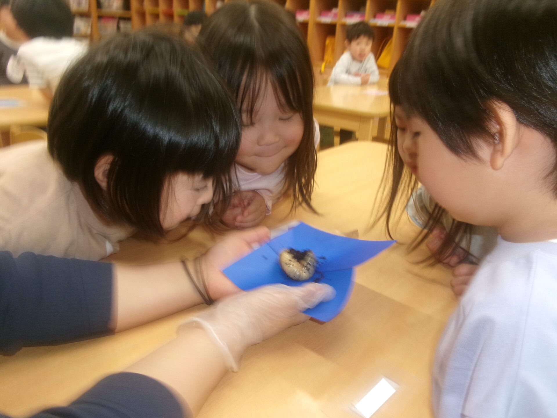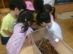 大きくて存在感のあるカブトムシの幼虫に驚き、興味を持った子ども達でした。