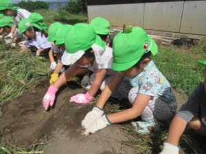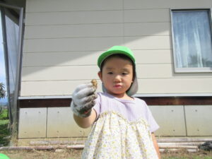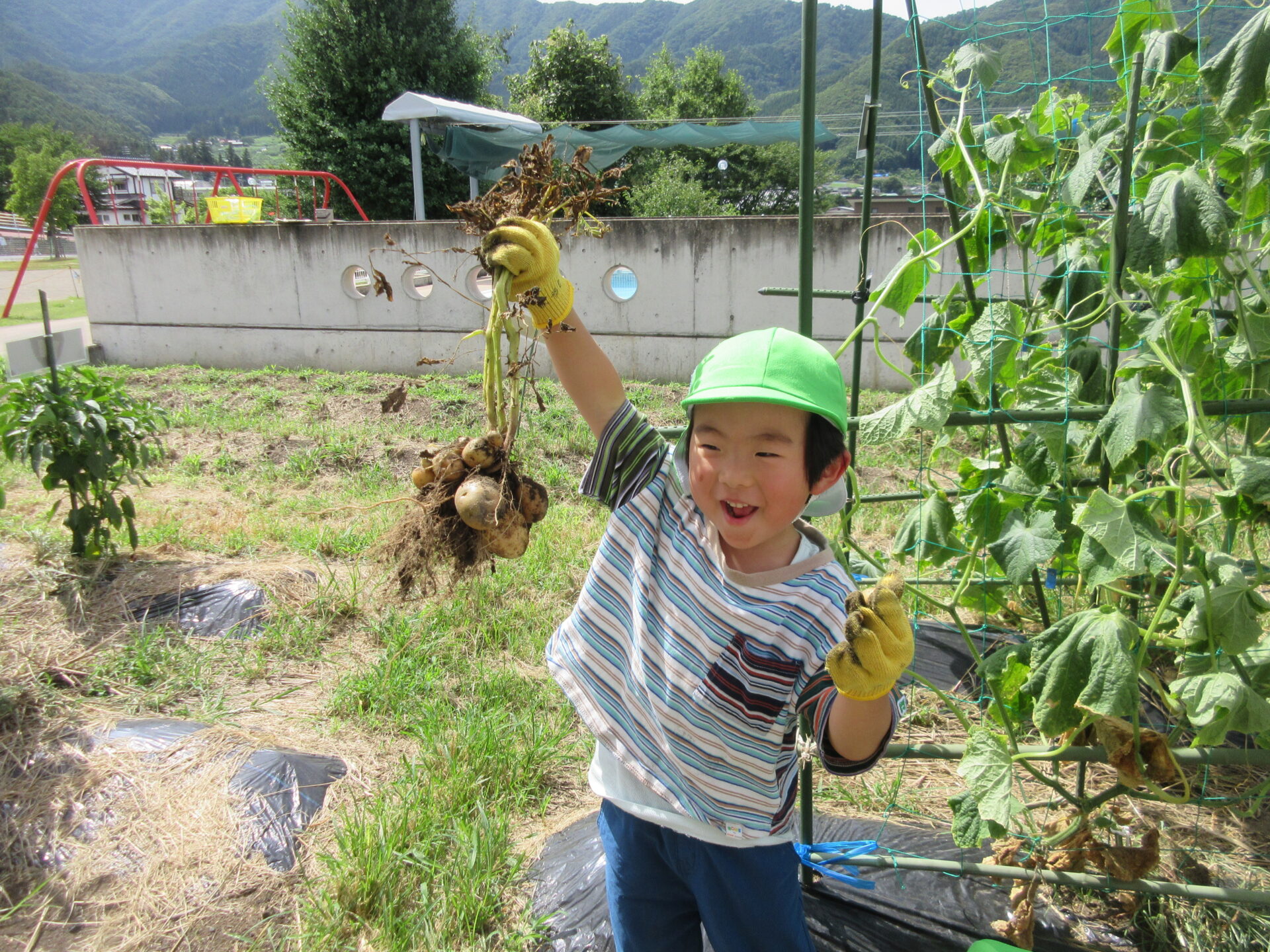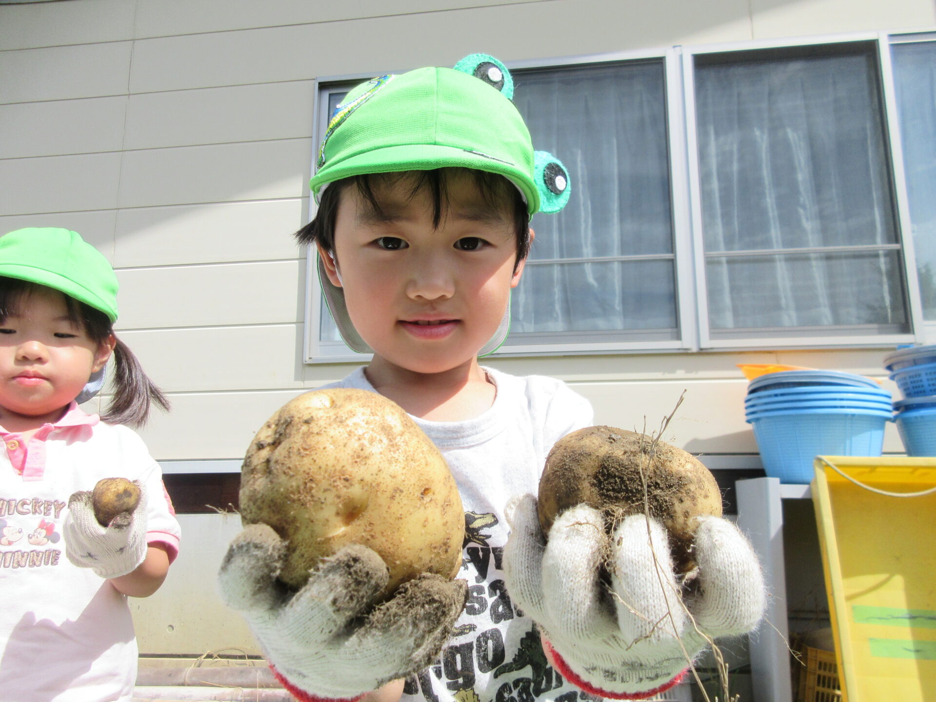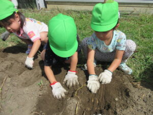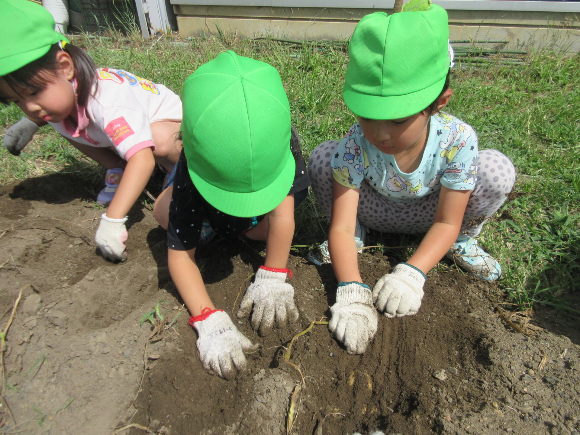 友だちと協力して、じゃがいもを傷つけないように優しく掘り、大きいじゃがいもかな?小さいじゃがいもかな?とドキドキワクワクして、まるで宝探しのように楽しむ子ども達。そんな子ども達の姿を見てこれからも子ども達の発見や学び、楽しさを大切にした活動をしていきたいと思いました。