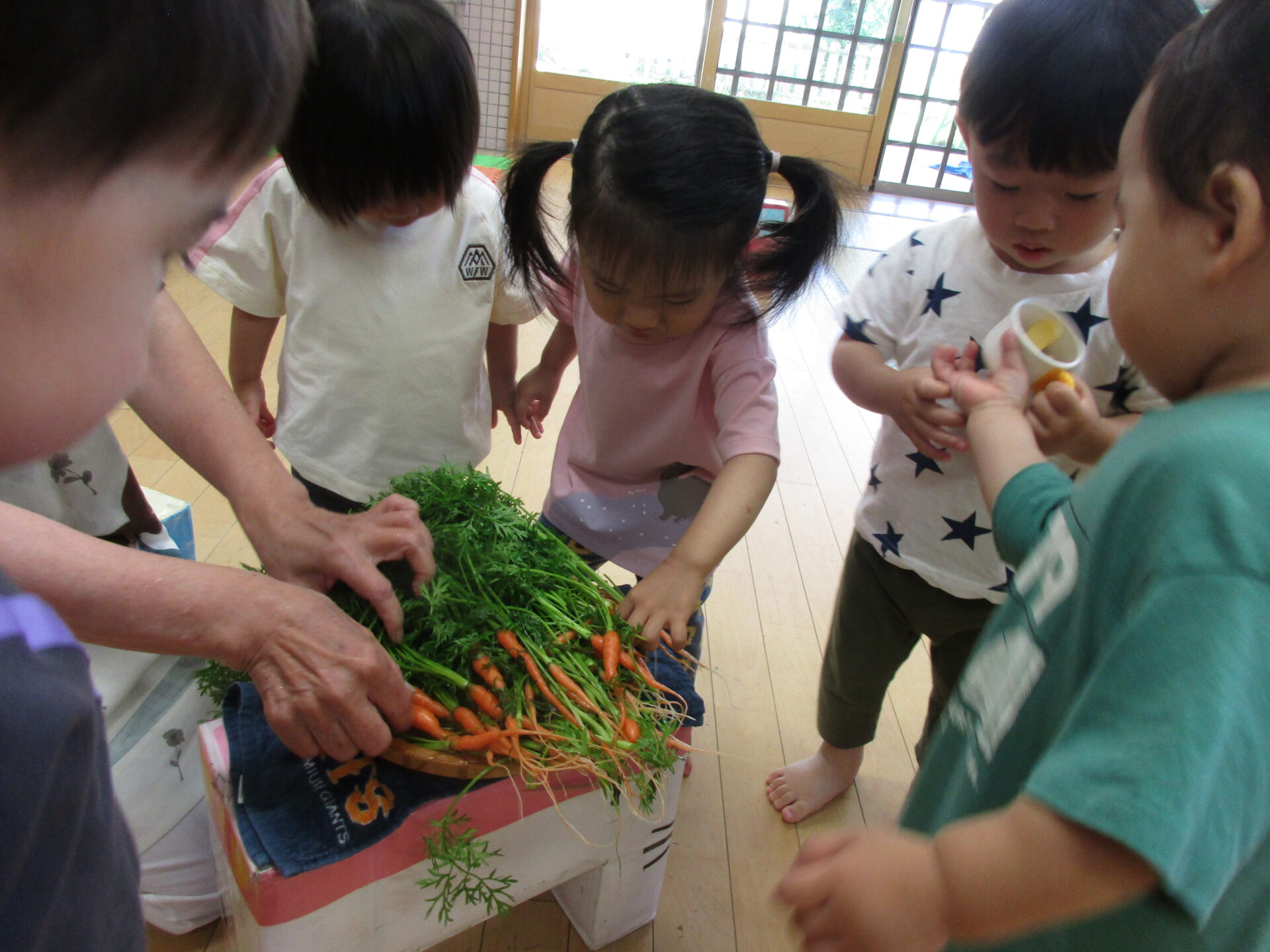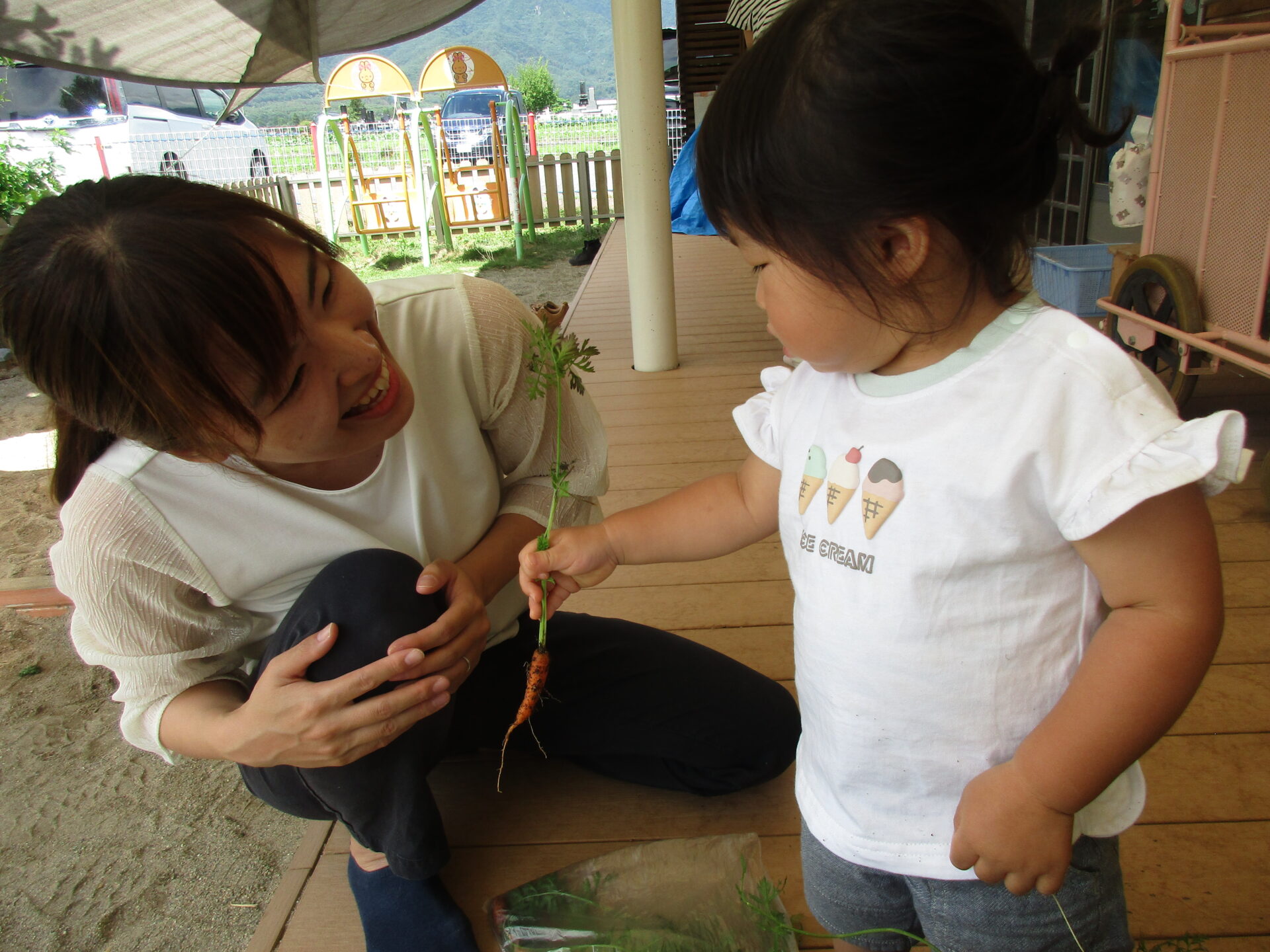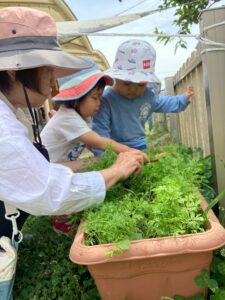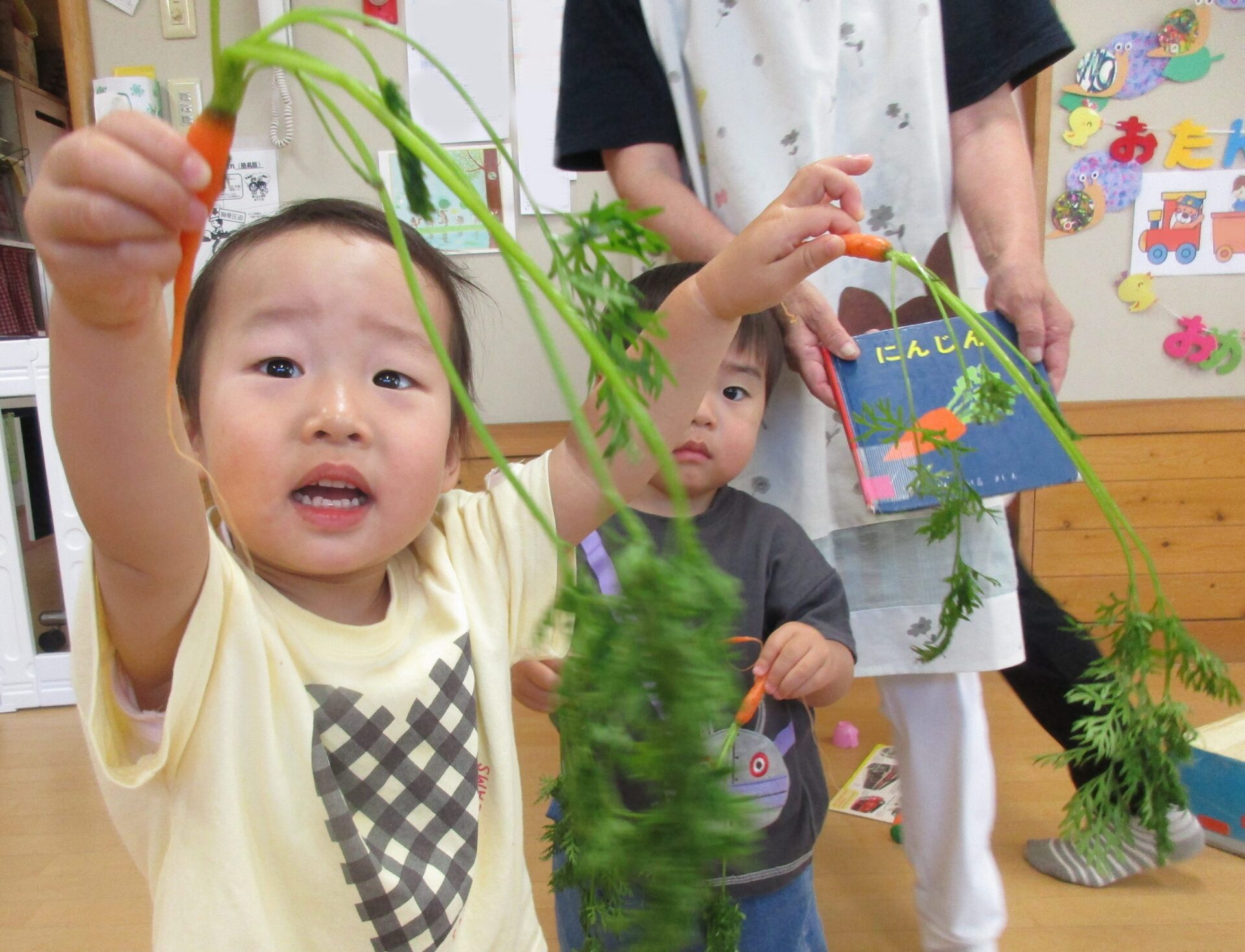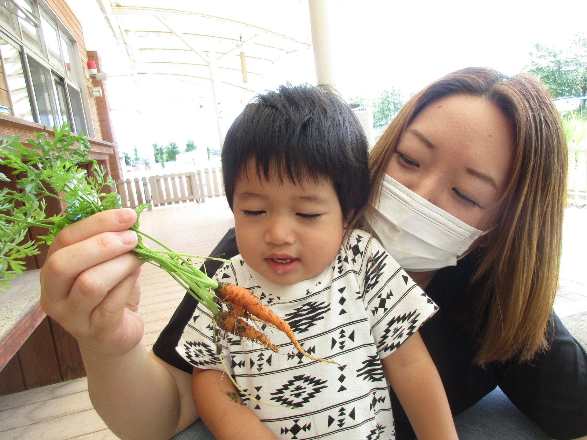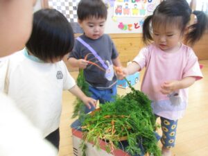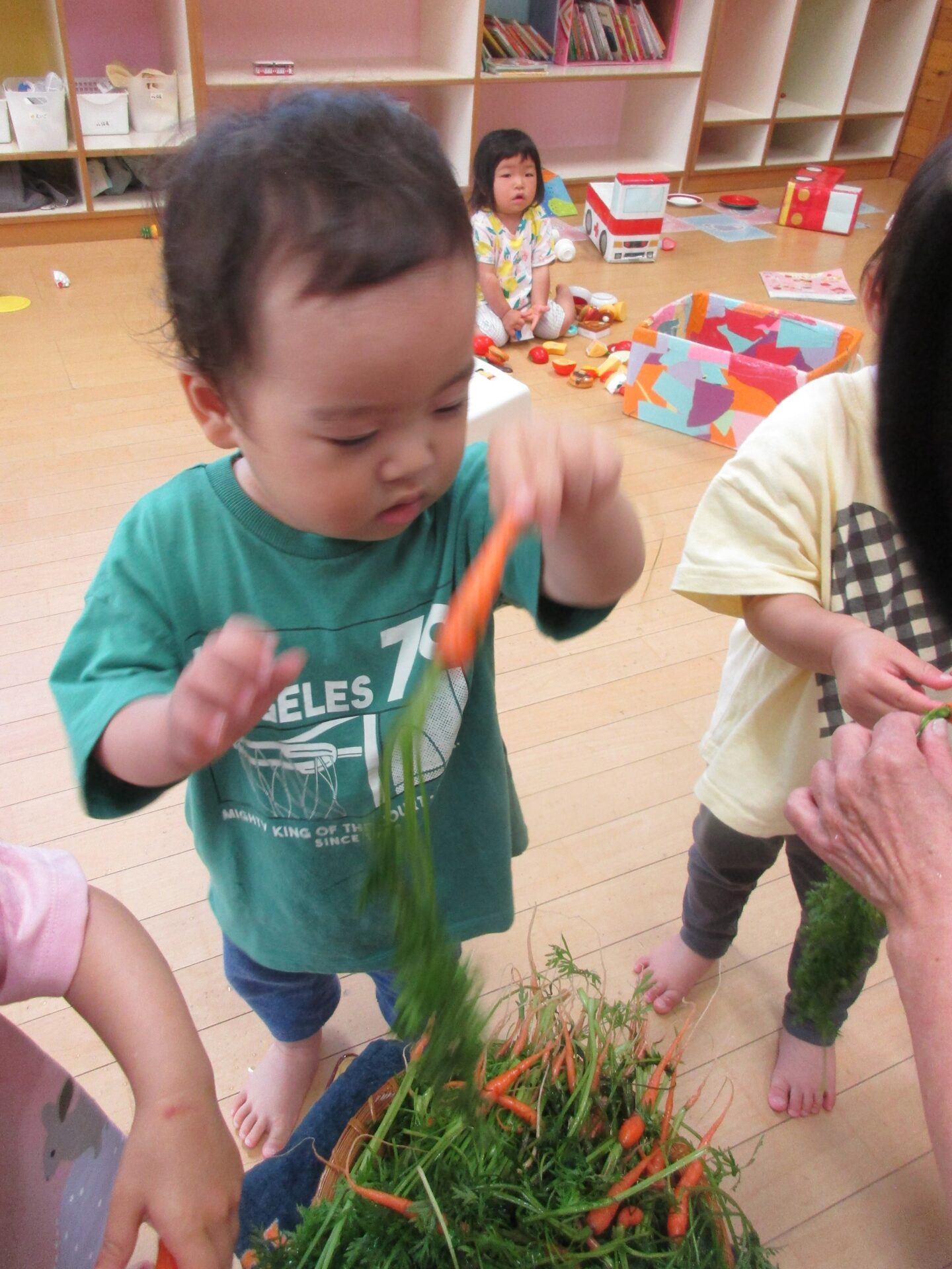 芽が出た段階ではなんだろう?とわからなかった子たちも、にんじんが見えると知っている事と繋がったようで、興味を持つ子が多かったです。