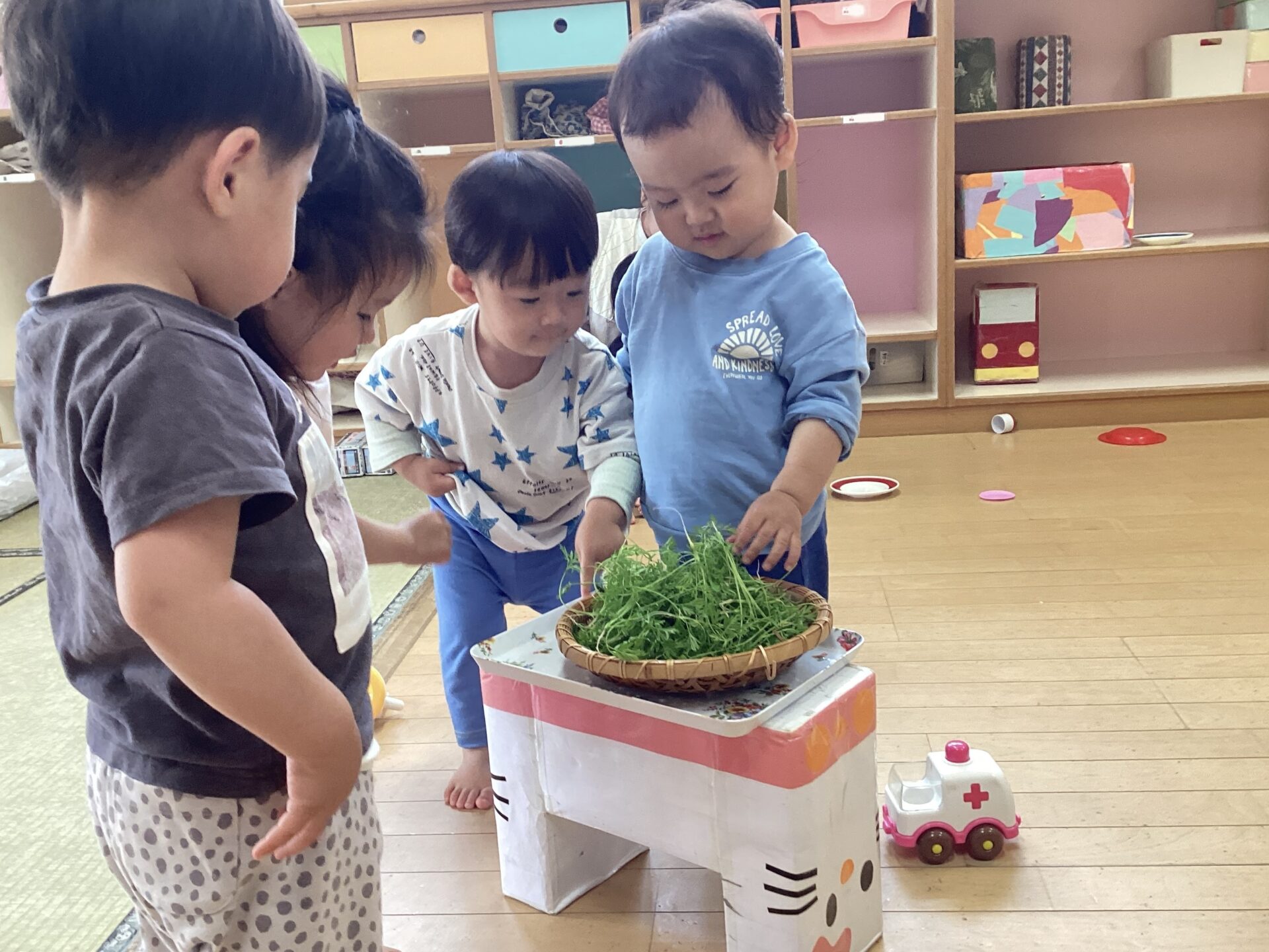 お部屋に持ってきて観察してみると、知ってる野菜だと思ったのか触れてみる子もいました。
