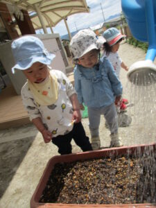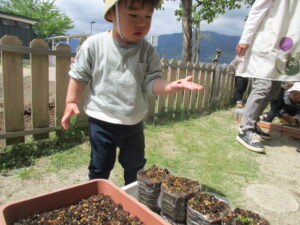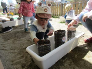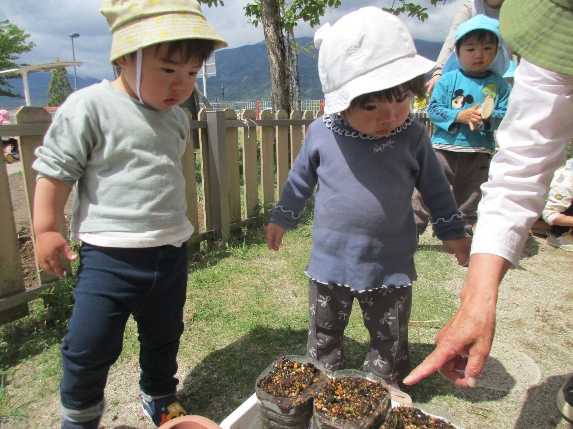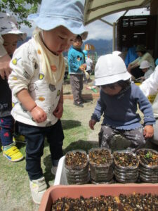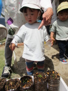 なんだ?と思った子は芽を近くで見てみたり、土をそっと手に乗せてみたり興味を持った様子でした。