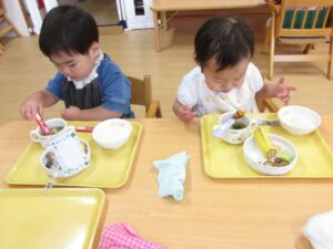 その日の給食のすまし汁には間引いた葉と、ちいさなにんじんも入れてくださり「にんじん!」と嬉しそうに食べる姿もありました。
