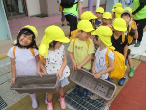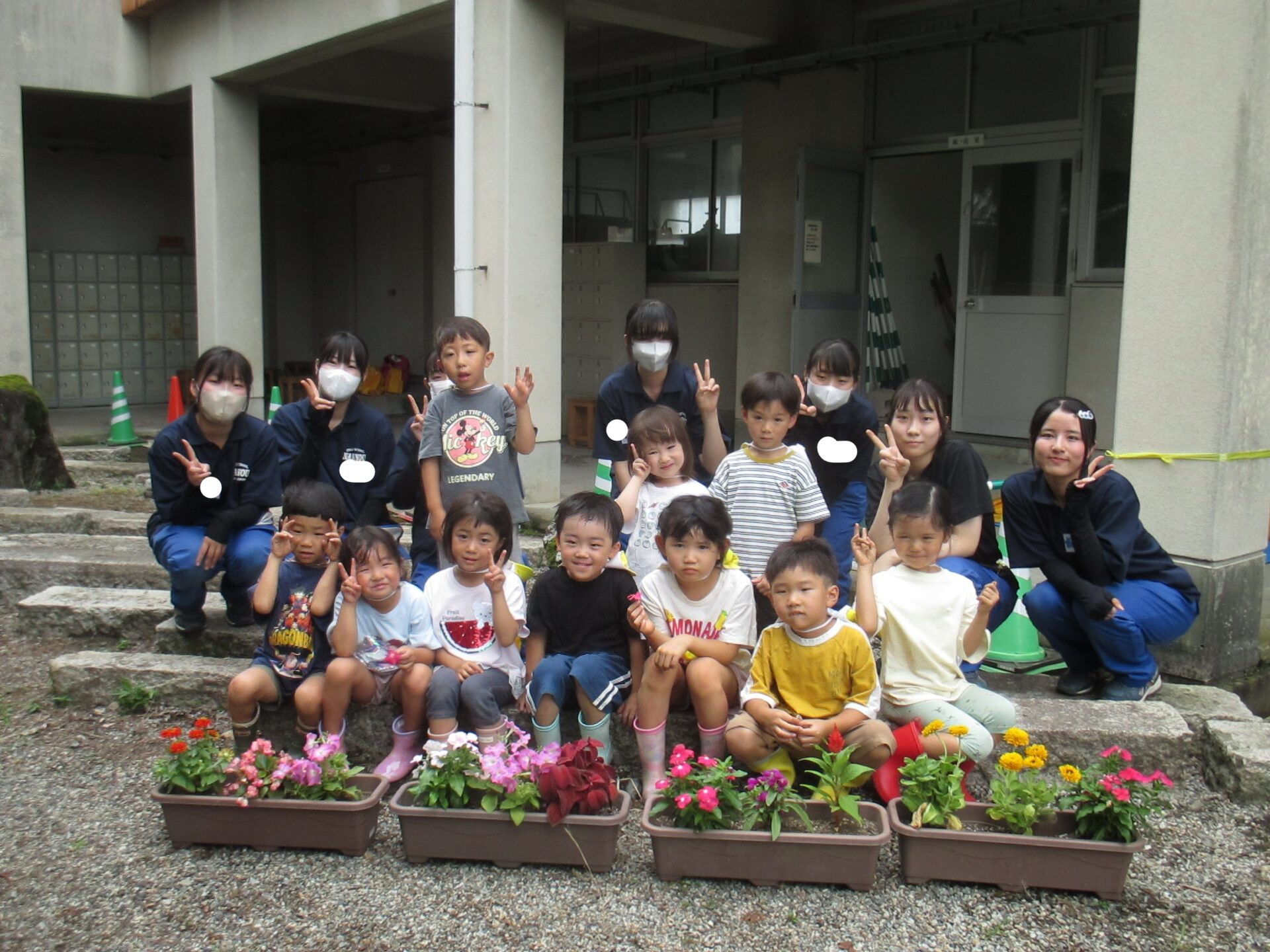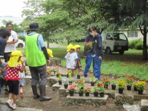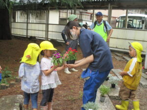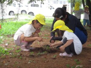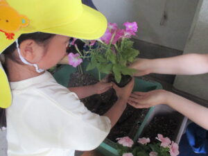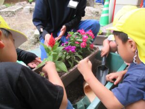 今回は、素敵な計画にお誘いいただき、緊張しながら参加した年中組でしたが、花や土に触れ、虫も探す中で自然と会話や笑顔が増えていきました。