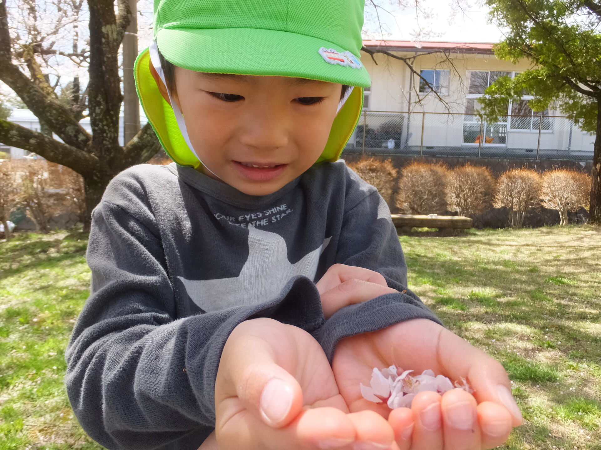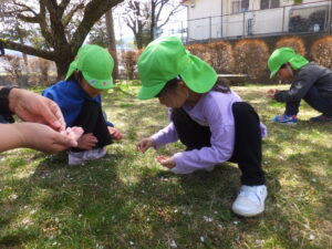 お友だちと一緒に花びらを拾う中で数に触れる経験をしたり、友だちの姿に目を向けたり、風に舞う花びらを追いかけて走ったりと同じ桜でも子ども1人ひとり違った遊び方や体験があります。どれも大切な時間です。友だちと一緒に四季折々の季節をたのしんでほしいと願っています。