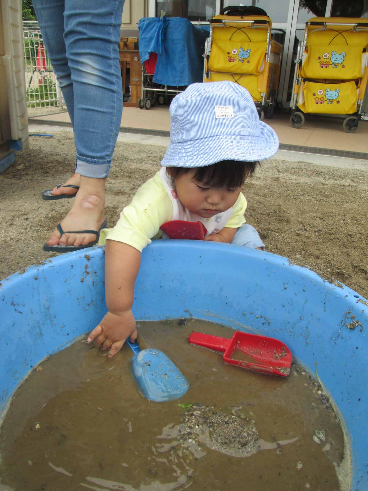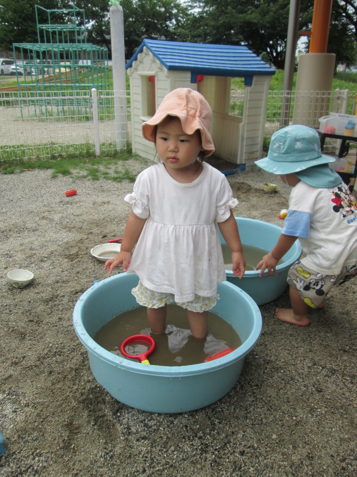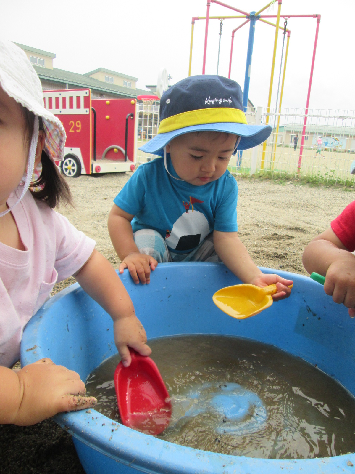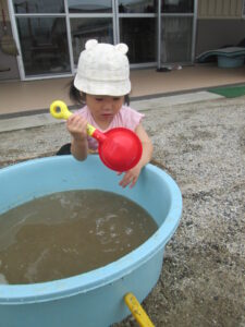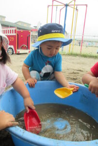 たらいの水を複数用意し、ダイナミックに遊びたい子、ちょっと触ってみたい子、それぞれのペースで遊べるようにしました。手を水の中に入れたり、砂を入れてみたりして、表情がパッと変わる子もいました。水の感触や気持ちよさを感じながら、この時期にしかできない遊びを思い切り楽しんでいきたいです。
