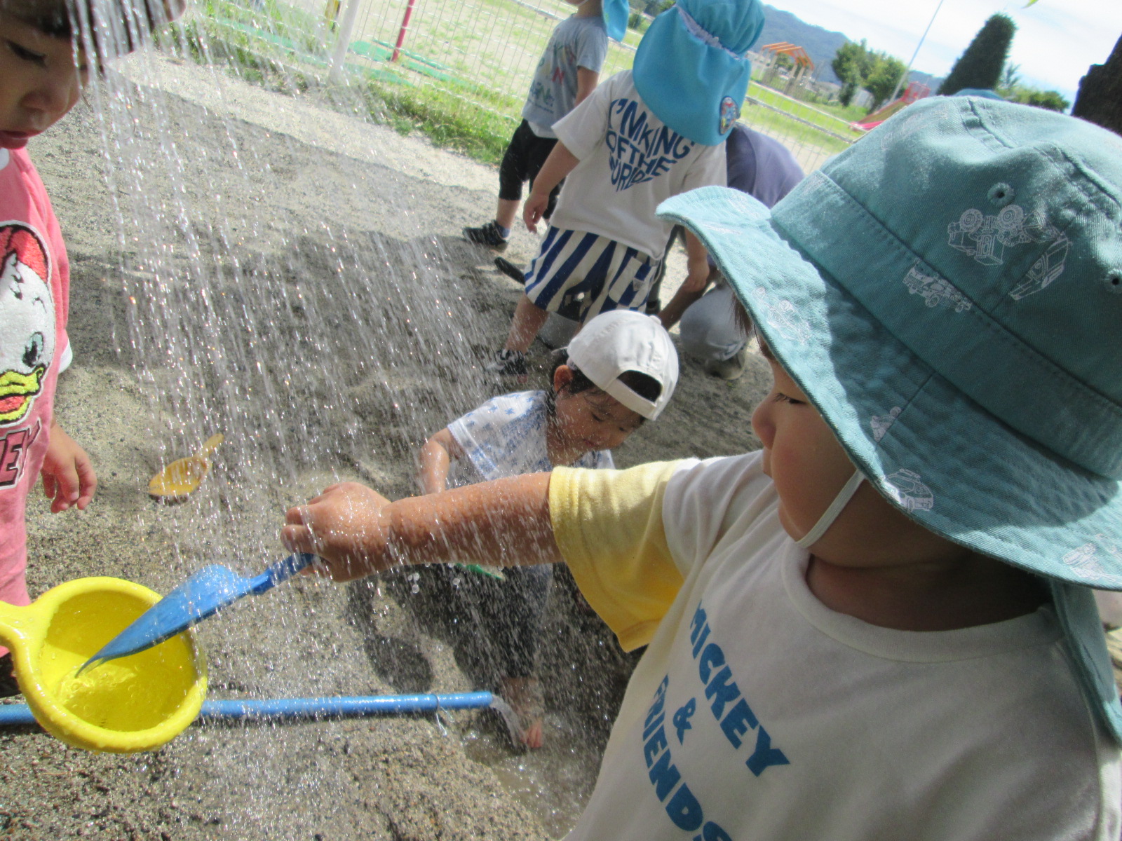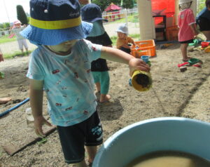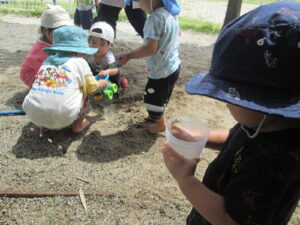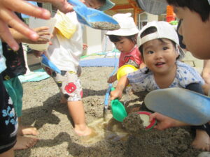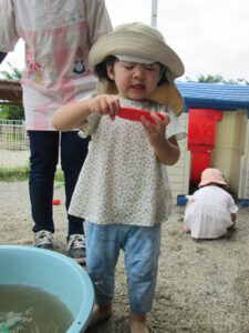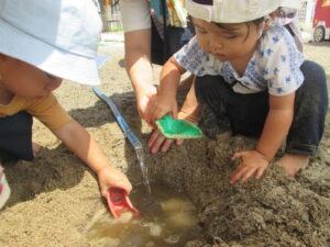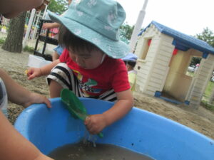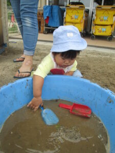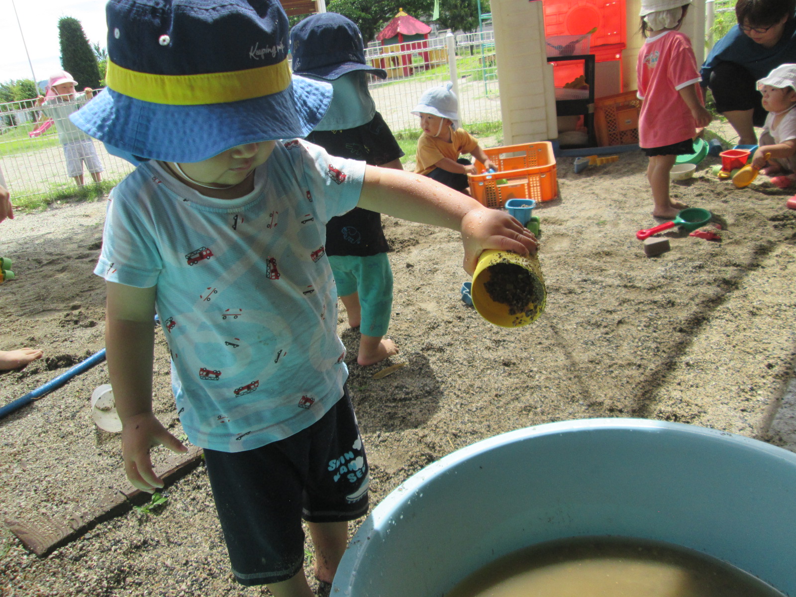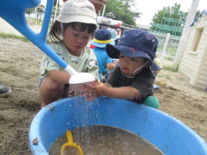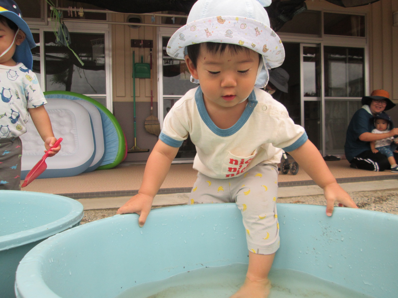 たらいの水を複数用意し、ダイナミックに遊びたい子、ちょっと触ってみたい子、それぞれのペースで遊べるようにしました。手を水の中に入れたり、砂を入れてみたりして、表情がパッと変わる子もいました。水の感触や気持ちよさを感じながら、この時期にしかできない遊びを思い切り楽しんでいきたいです。