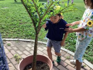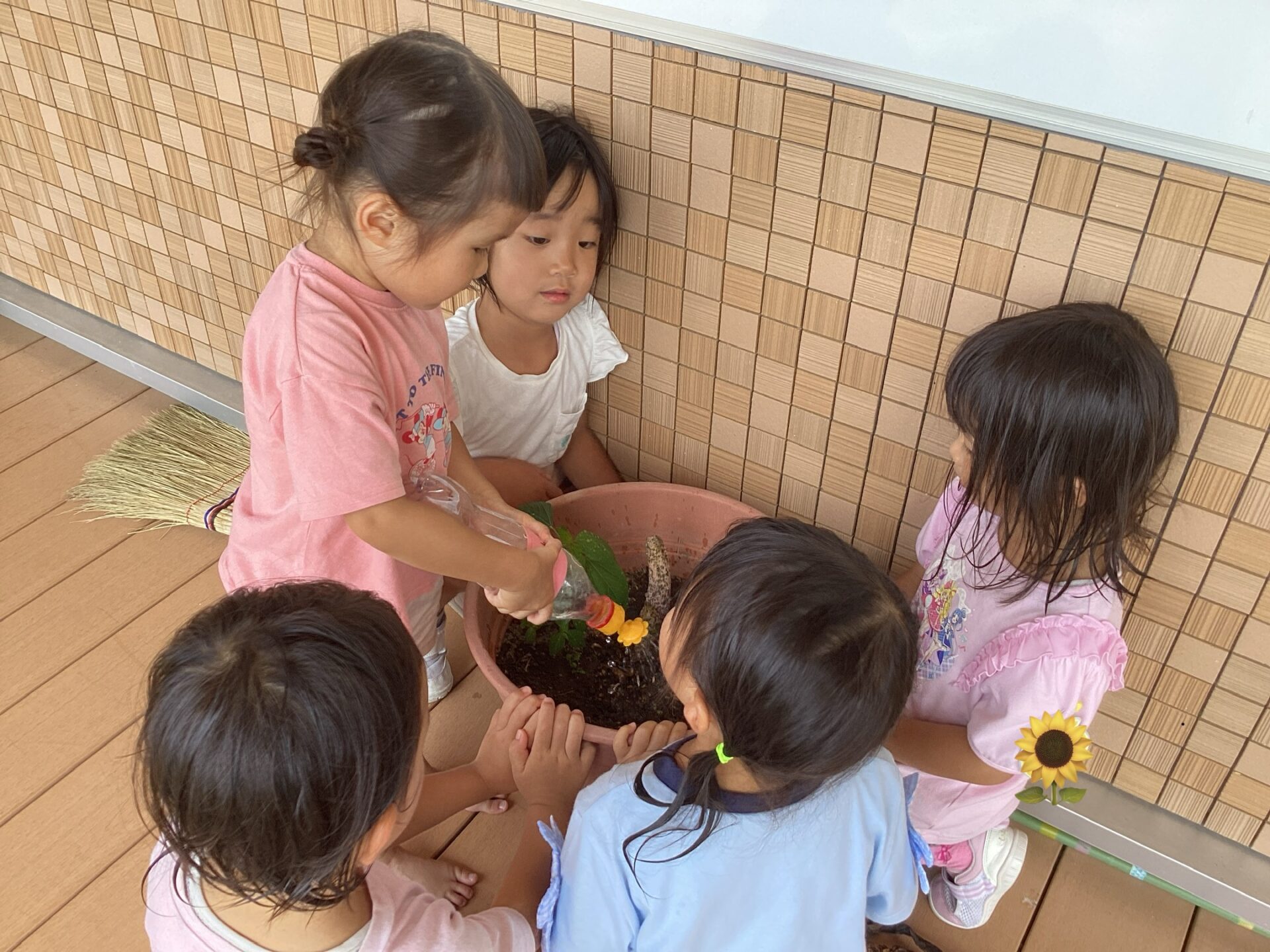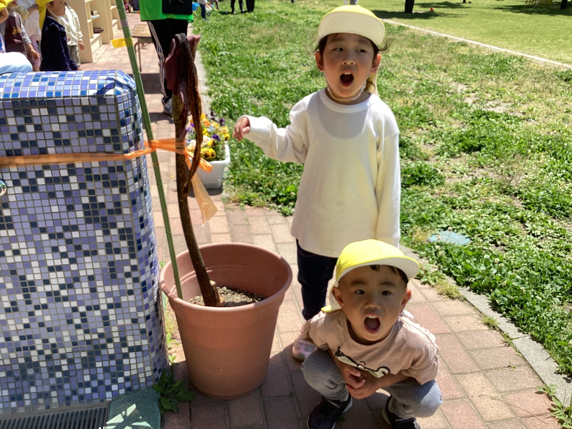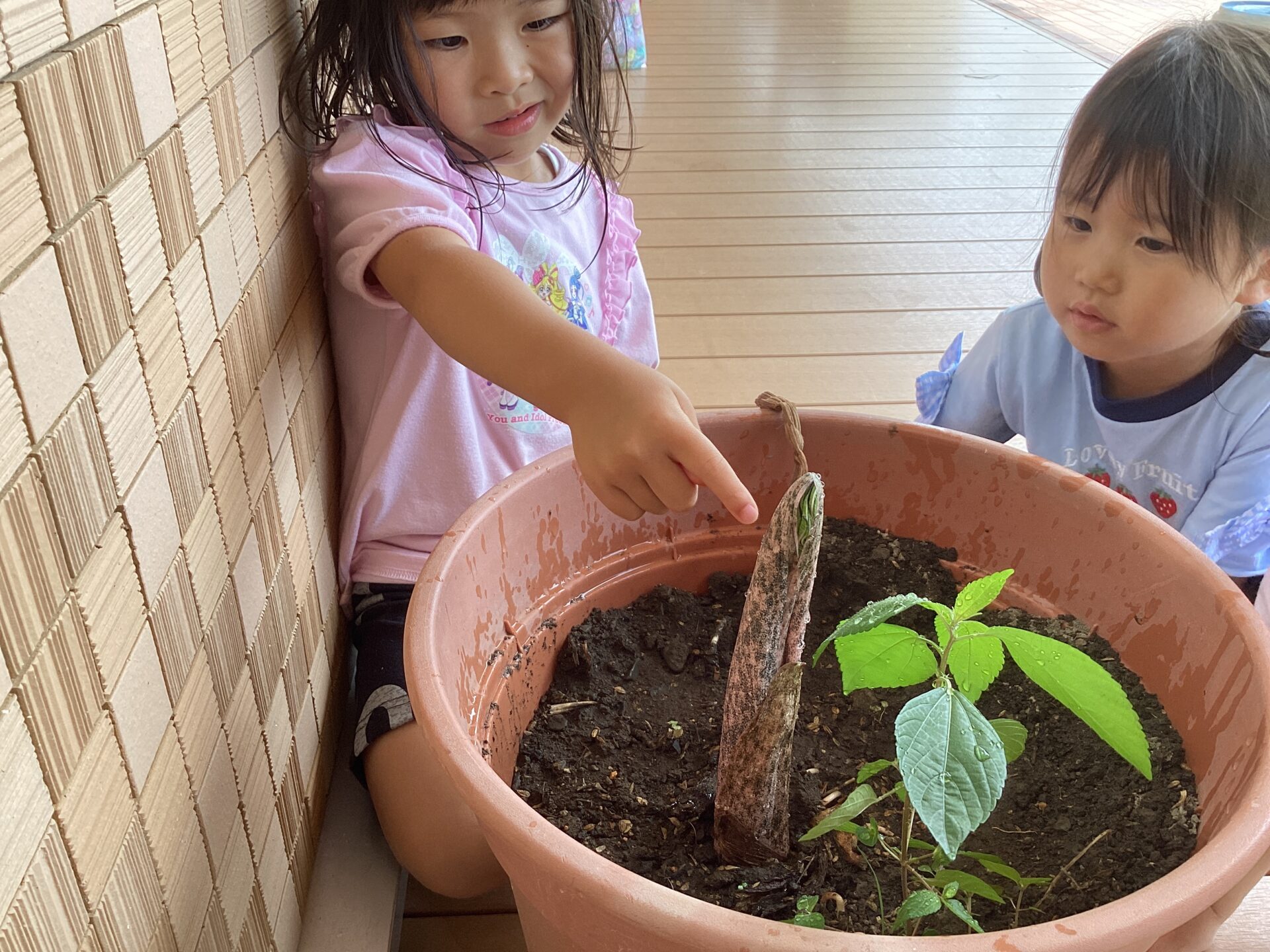 もう終わりかな、と思っていたこんにゃくいも。まさか木になるとは思わず、子ども達と一緒に驚きました。みるみる生長していく様子が面白かったり、また出てきてくれたことが嬉しかったり、子ども達にとっても素敵な出会いになったのではないかなと思います。