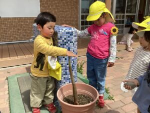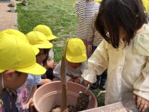 「なんだろう?」と不思議そうに見つめながら植えてみました。