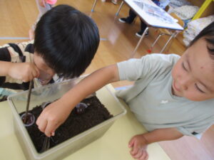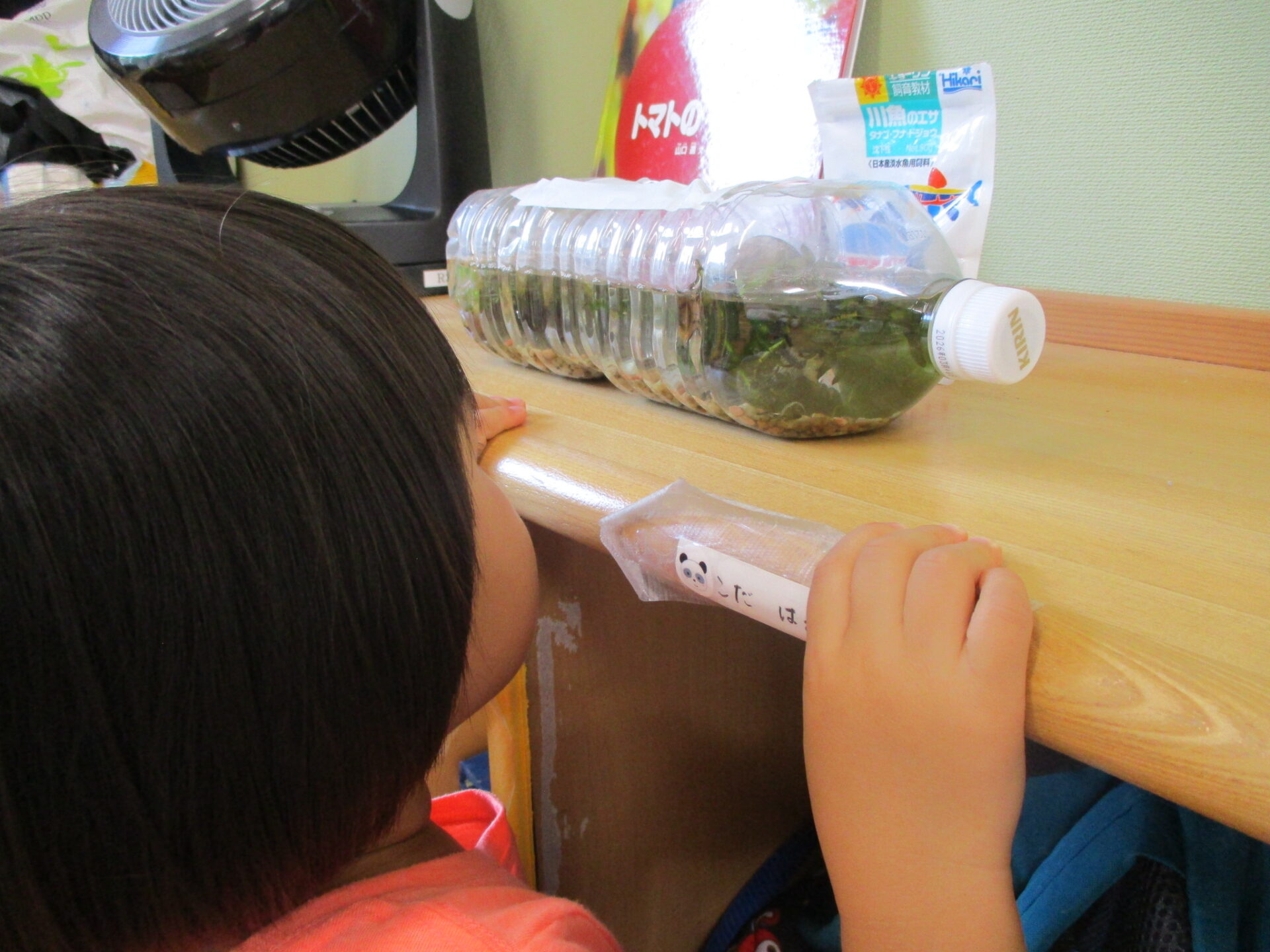 観察をしながらお世話の仕方を年中さんから教えてもらいます。