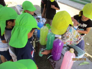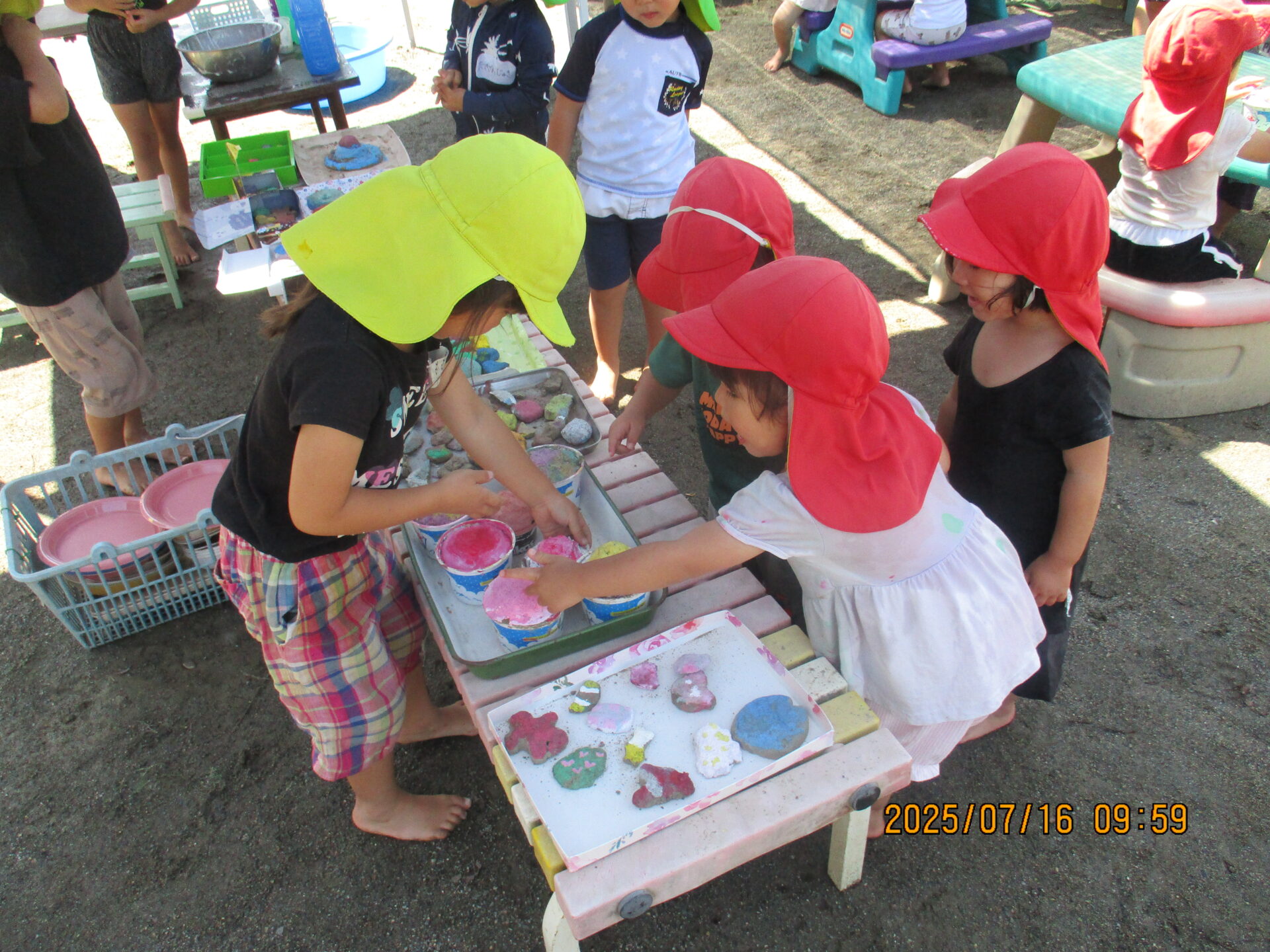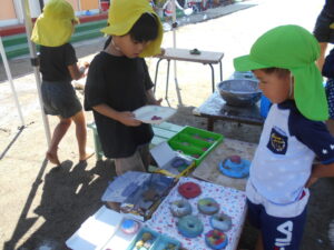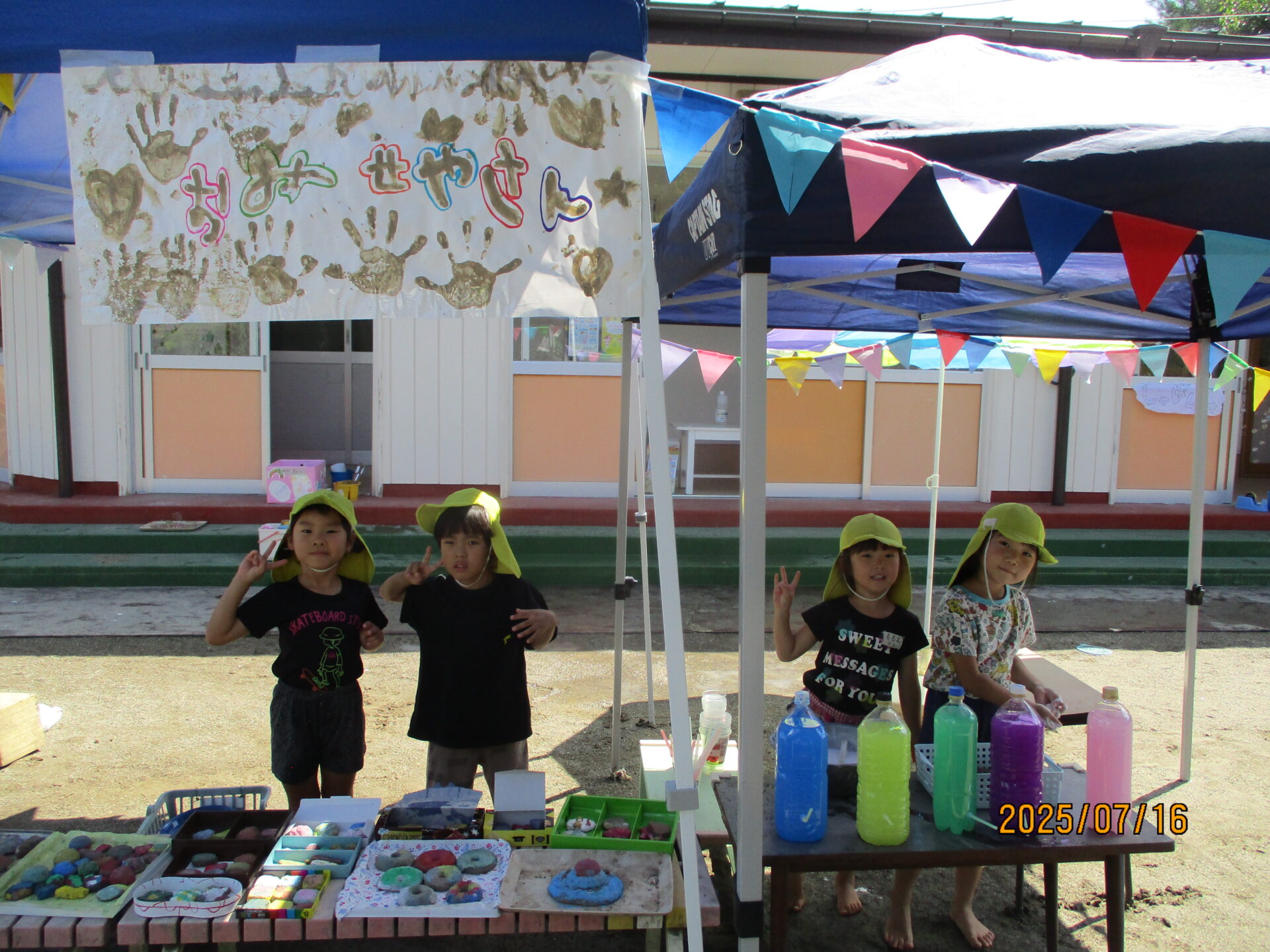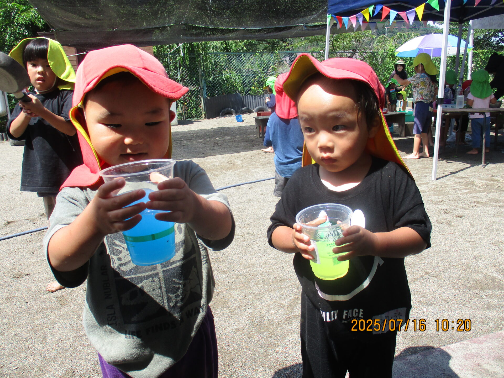 ・年中・少児が年長児の姿を見て、お店屋さんをやってみたいという姿もありました。次の日にどろんこ祭りパート2を開催して、1日目とは違った遊び方が見られ、継続して遊びを楽しむことができました。