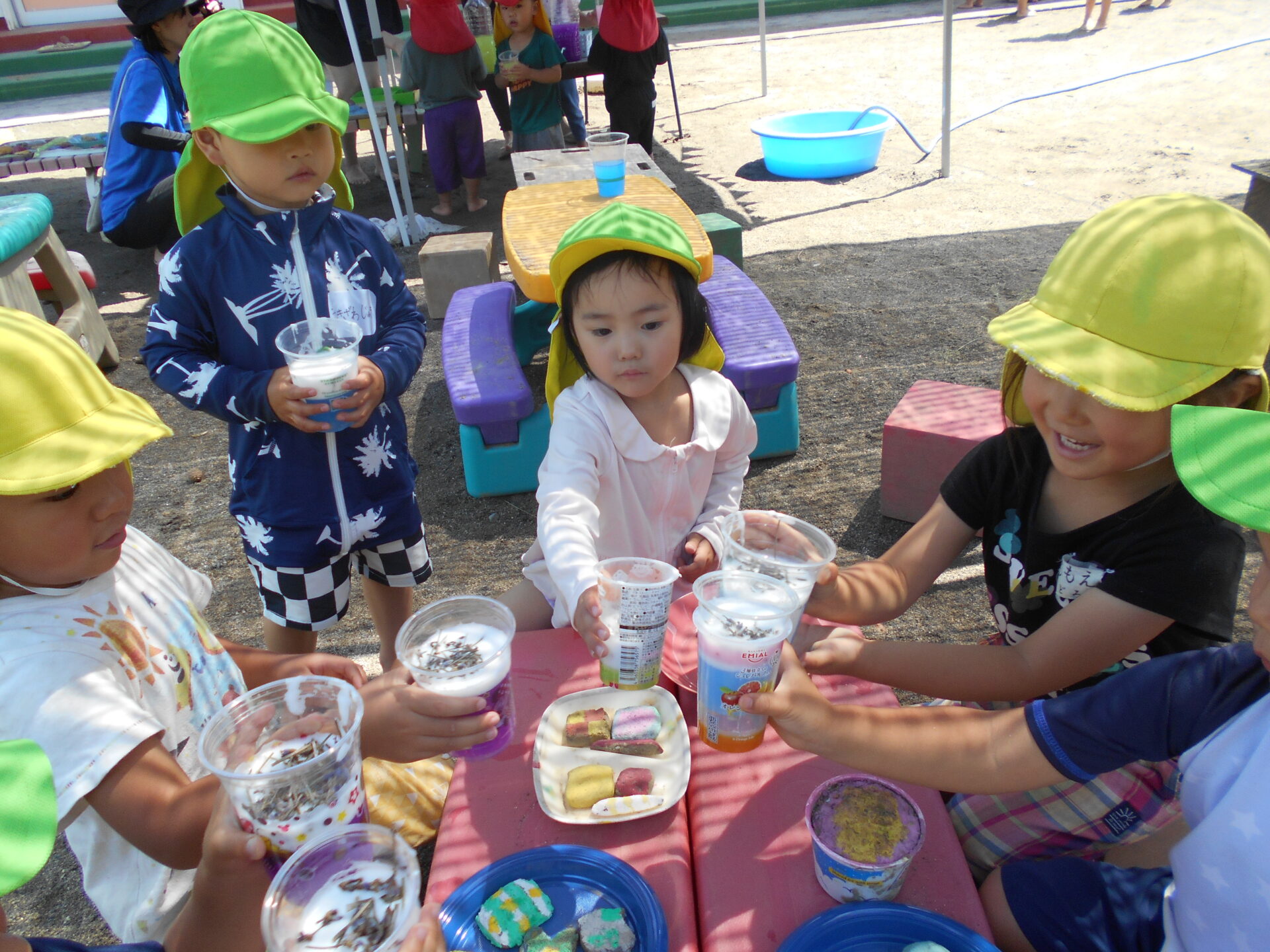みんなで作ってきたクッキーやジュースを使って「どろんこ祭り」を開催しました。