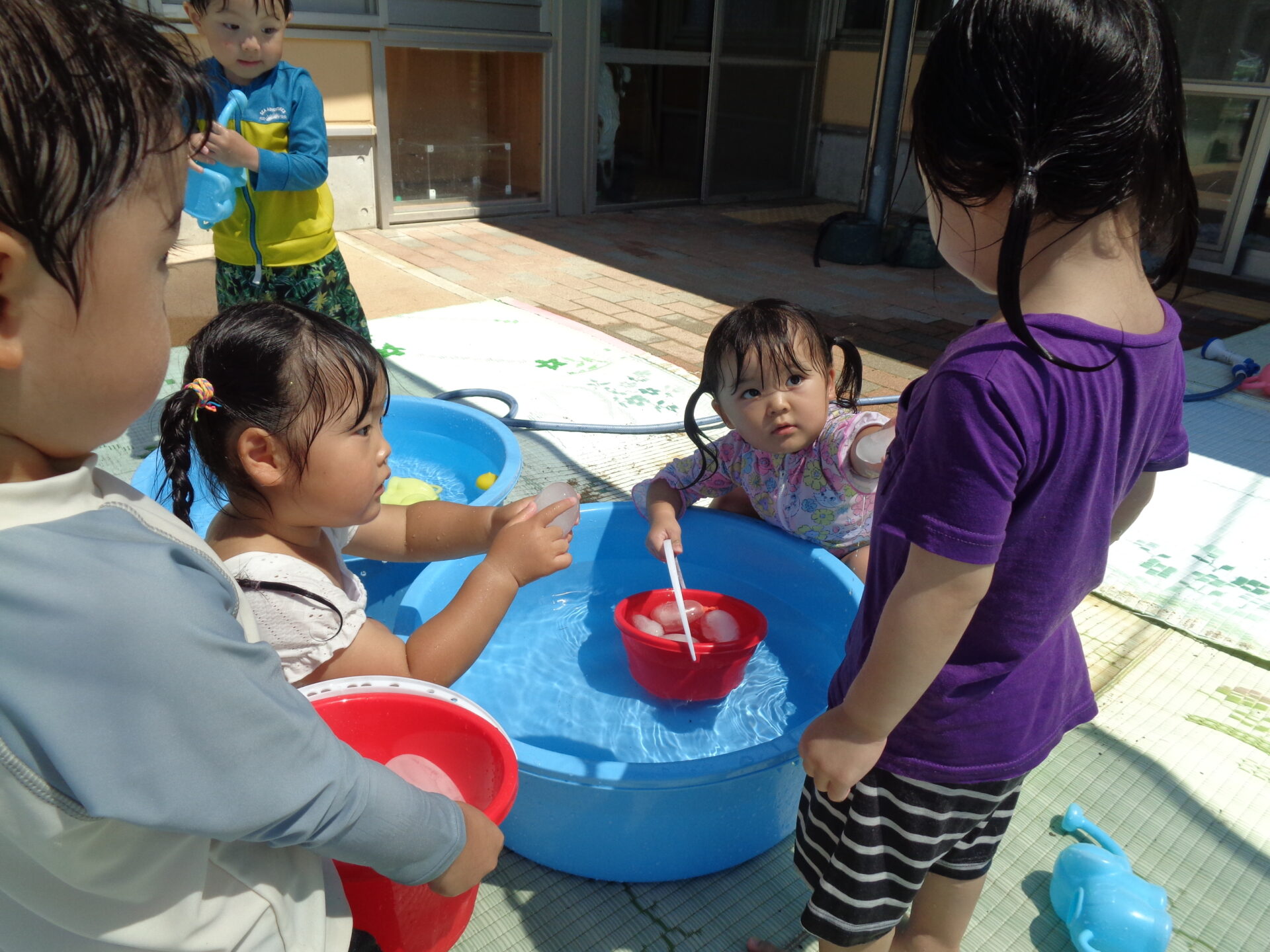 たらいやバケツに水を入れ、氷を浮かべて楽しんでいました。