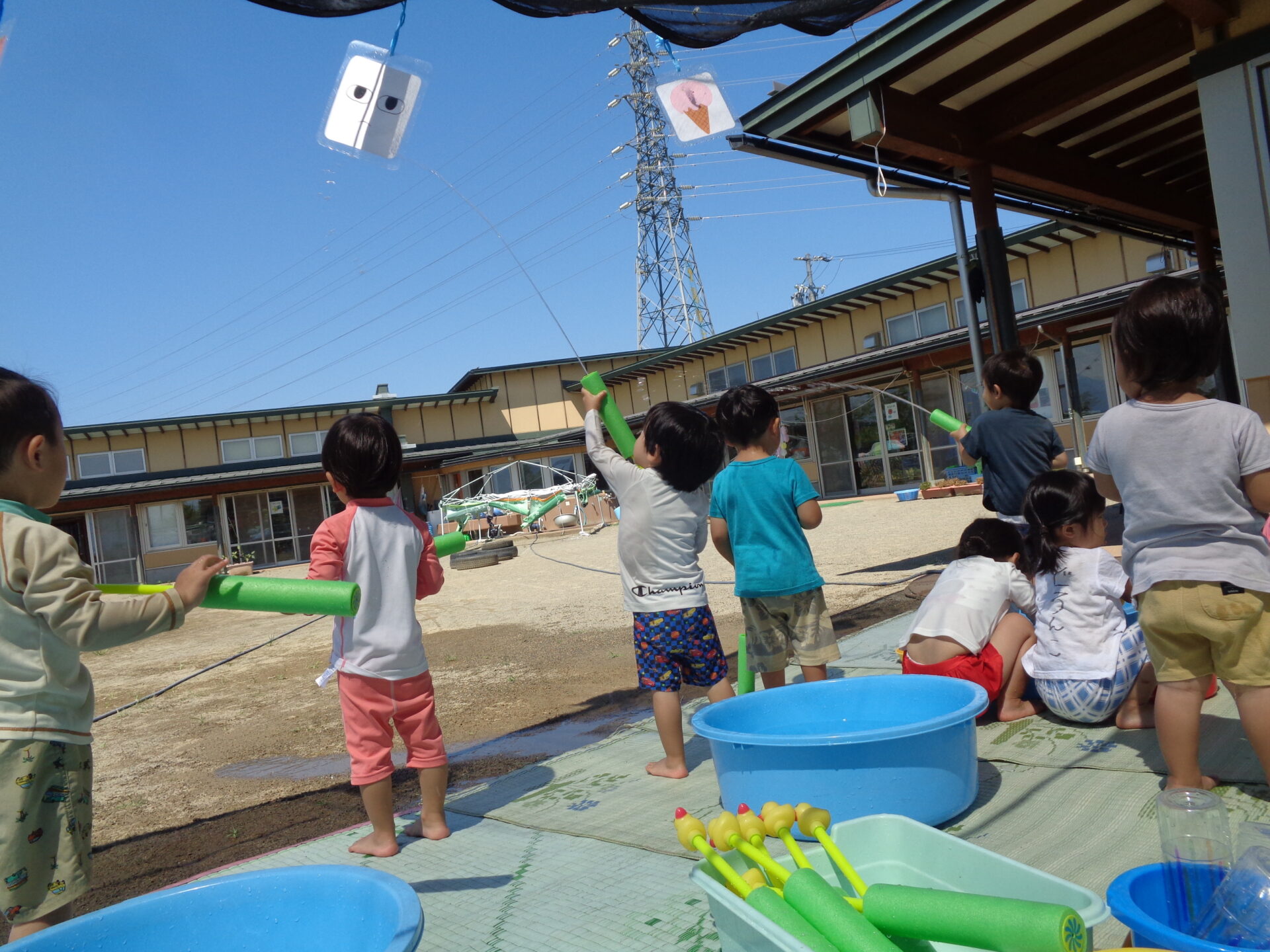 ・水鉄砲の水、的に当たると楽しいね。