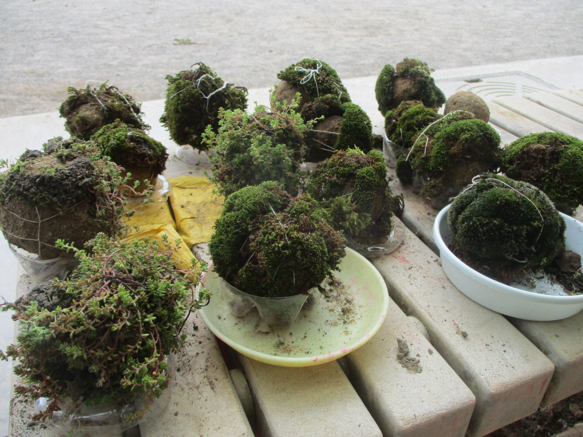 苔玉完成!苔の色の変化に気づいたり、「喉が渇いてる!」と水やりをしたりしながら一人一つ苔玉の世話をしています。
