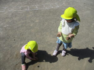 ・泥団子を使って遊びを展開するきっかけをつくることで、発見や気づきをクラスで共有することができた。また、苔を集めや糸を巻くことを友達と協力したり助けあったりしながら作ることができた。