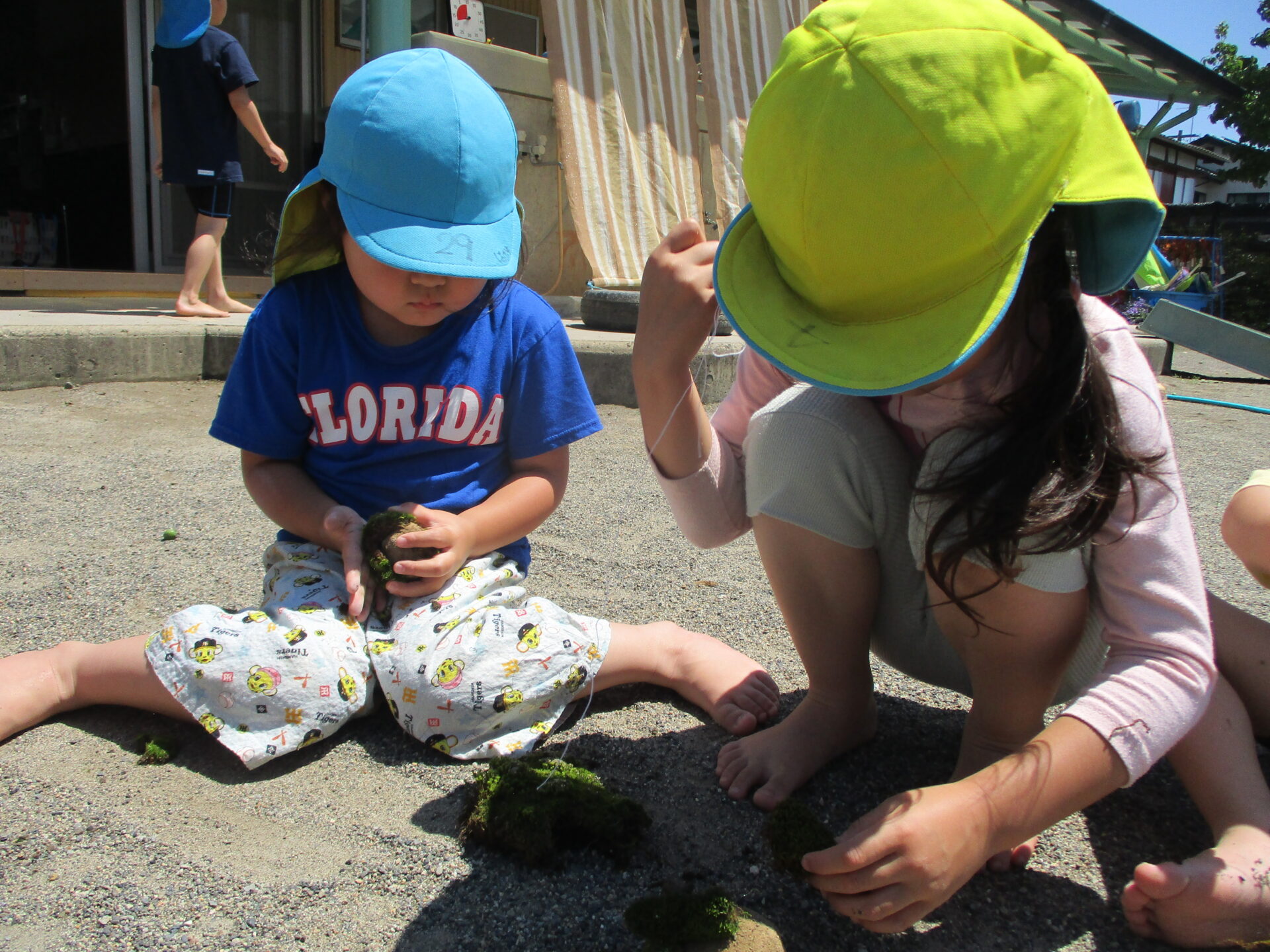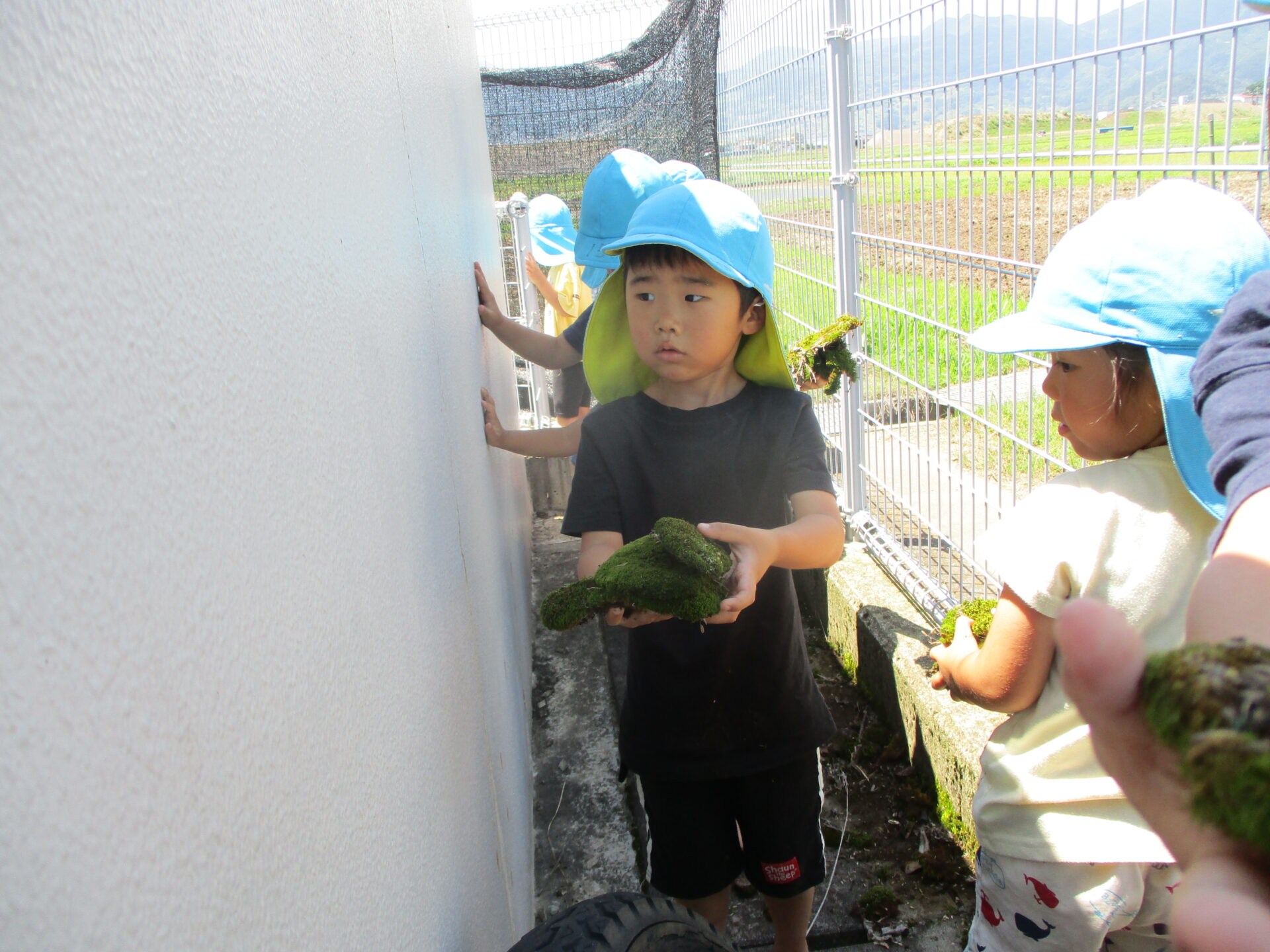 「あった!大きい苔を見つけたよ。」「もこもこ、ふわふわしている。」苔の感触を伝えてくれました。
