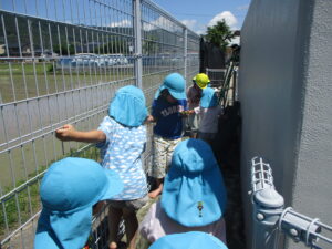 いつもは入れないプールの横のフェンス沿いを、ドキドキしながら静かに歩く子どもたち!「こんなところにあるわけないよ。」と小声でやりとりしていました。