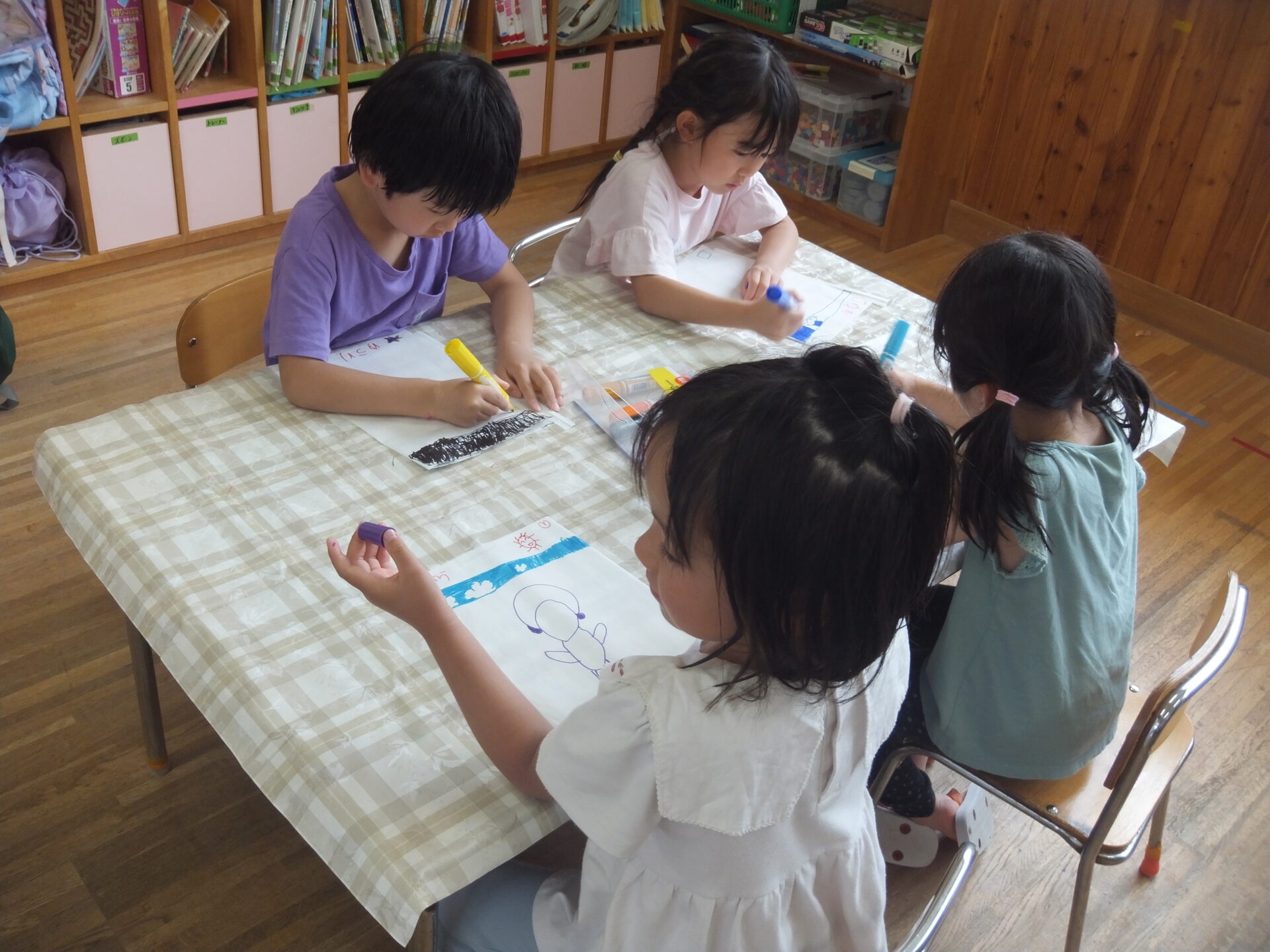 一人ずつ好きなぶどうを選んで袋をかけることを伝えると、絵や名前をかいて、自分の袋作りが始まりました。
