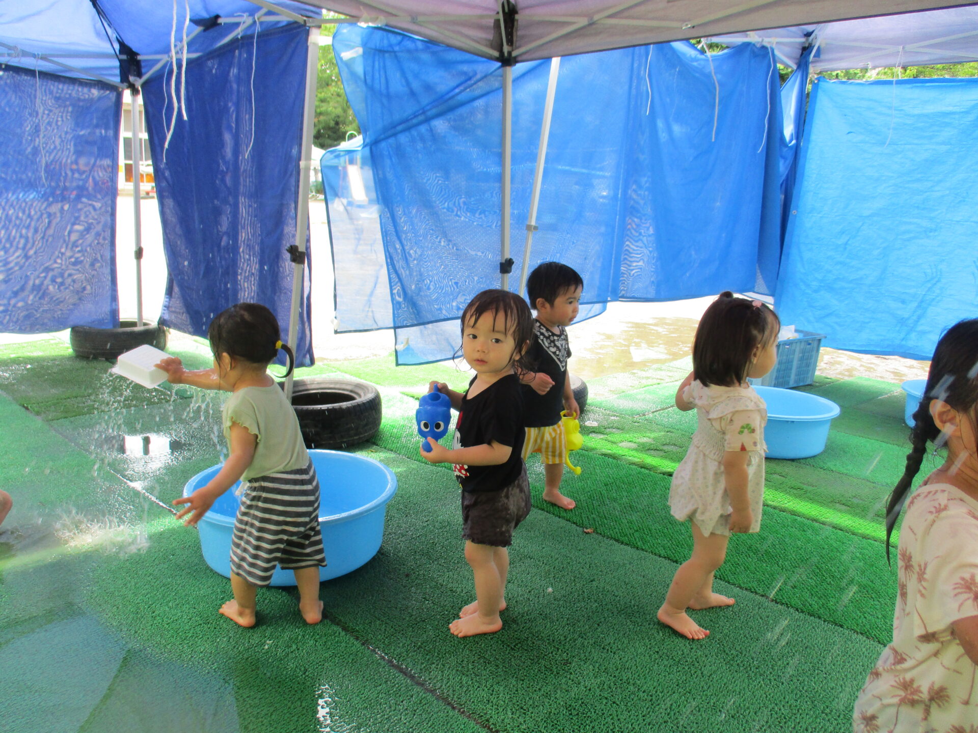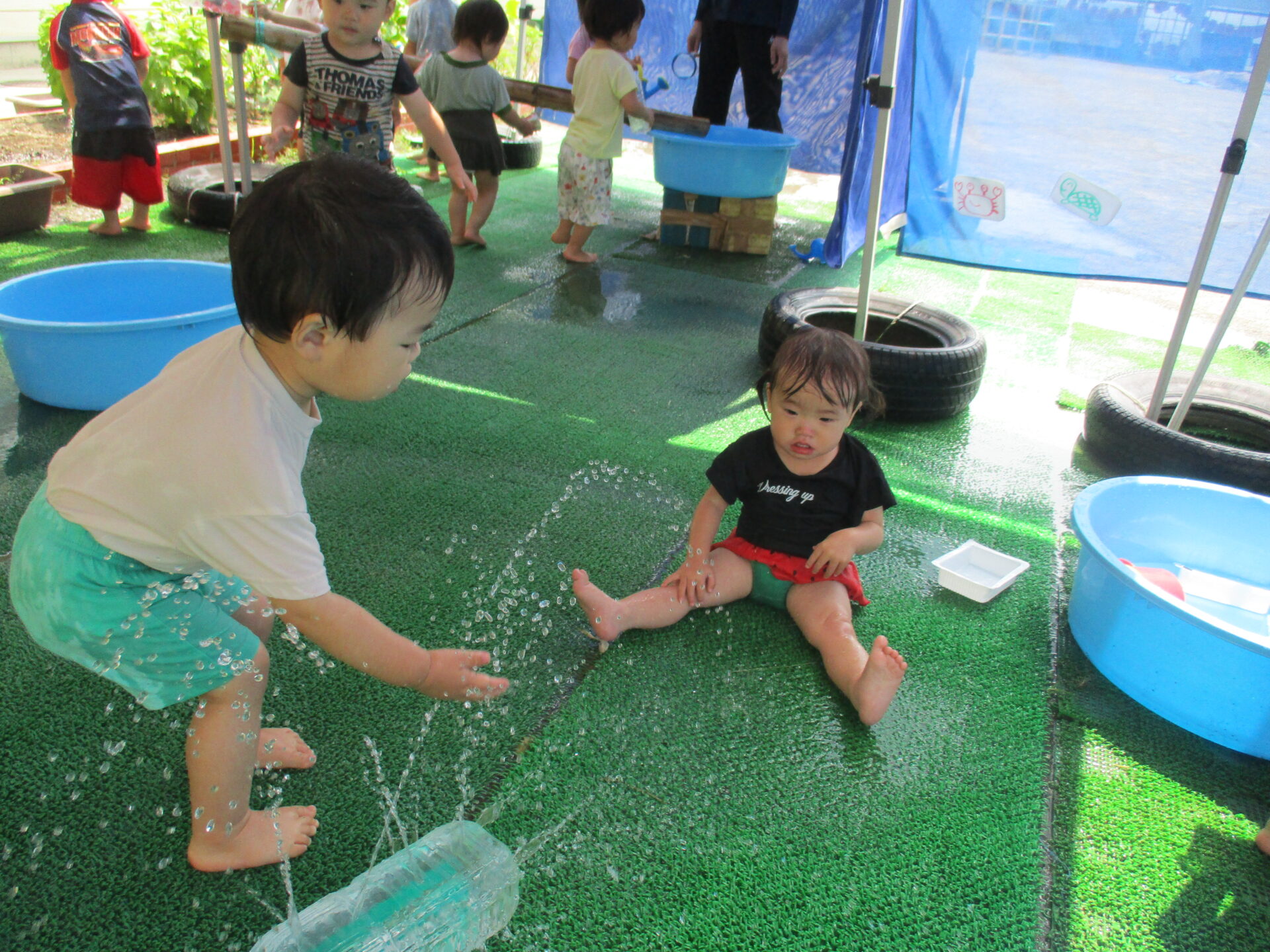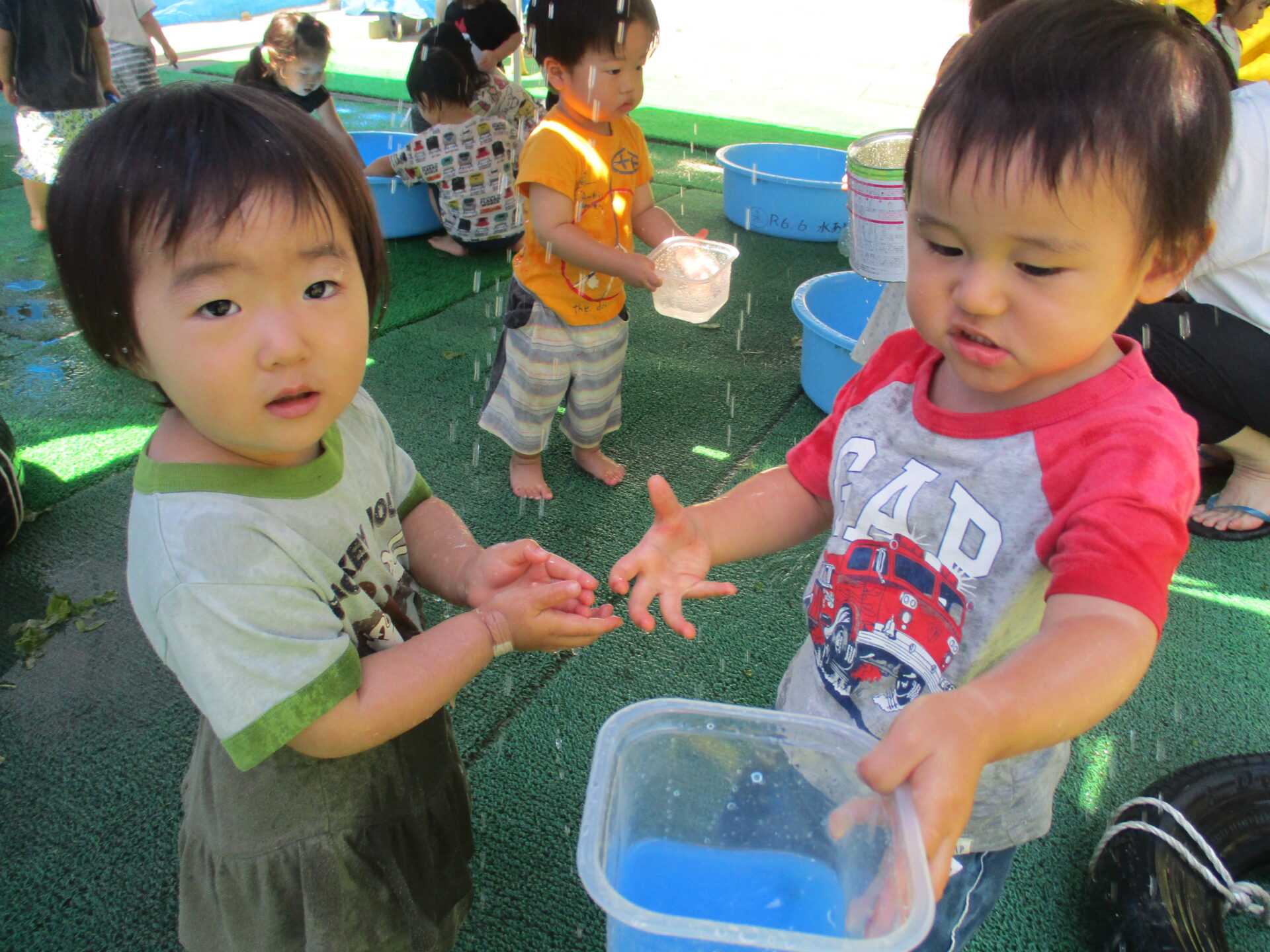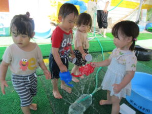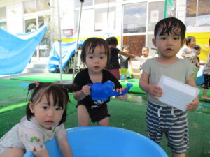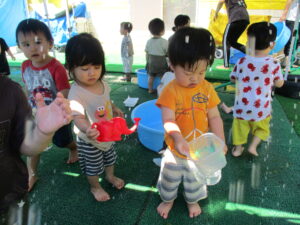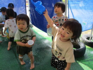 初めての水遊びで少し不安だった子も、楽しそうに遊ぶ年上児の友達を見て「やってみようかな」と自然に遊びに加わることができました。何度か繰り返していくうちに、いつのまにか夢中で水遊びを楽しむ姿がありました。