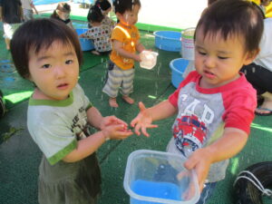 暑い夏だからこそできる遊びをたくさん楽しんでほしいという思いから、水、絵の具、泡などを用意し、様々な感触遊びを楽しめるようにしました。水遊びを通じて、さらに水と仲良しになっていってほしいと思います。